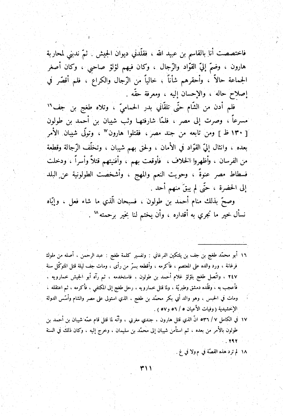 فَلم أدن من الشَّام حَتَّى تَلقانِي بدر الحمامي، وتلاه طغج بن جف مسرعا، وصرت إِلَى مصر، فَلَمَّا شارفتها وثب شَيبَان بن أَحْمد بن طولون وَمن تَابعه من جند مصر، فَقتلُوا هَارُون، وَتَوَلَّى شَيبَان الْأَمر بعده، وانثال إِلَيّ القواد فِي الْأمان وَلحق بهم شَيبَان، وتخلف الرجالة وَقطعَة من الفرسان، وأظهروا الْخلاف، فأوقعت بهم، وأفنيتهم قتلا وأسرا، وَدخلت فسطاط مصر عنْوَة، وحويت النعم والمهج، وأشخصت الطولونية عَن الْبَلَد إِلَى الحضرة، حَتَّى لم يبْق مِنْهُم أحد.