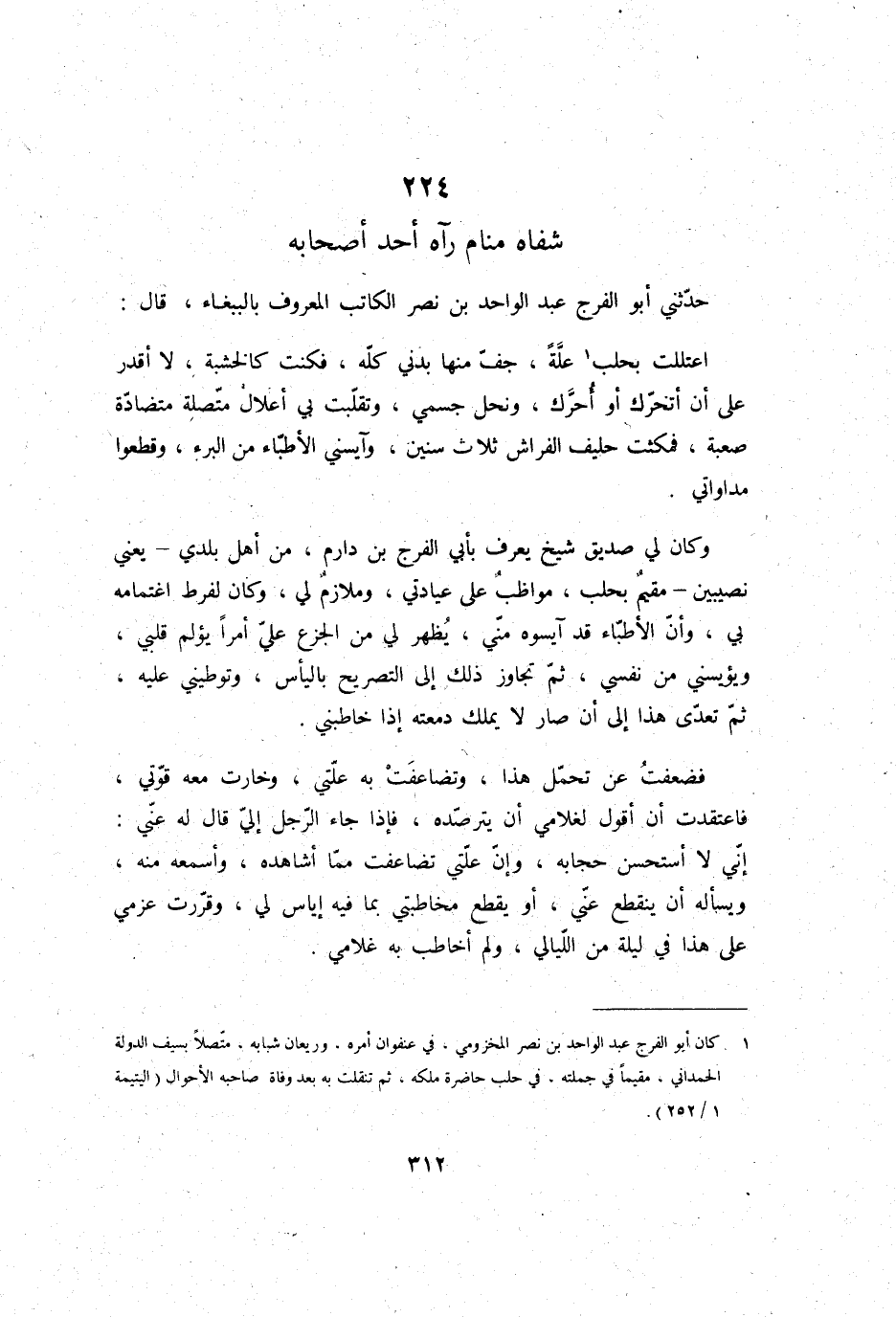وَكَانَ لي صديق شيخ يعرف بِأبي الْفرج بن دارم، من أهل بلدي، يَعْنِي: نَصِيبين، مُقيم بحلب، مواظب على عيادتي، وملازم لي، وَكَانَ لفرط اغتمامه بِي، وَأَن الْأَطِبَّاء قد آيسوه مني، يظْهر لي من الْجزع عَليّ أمرا يؤلم قلبِي، ويؤيسني من نَفسِي، ثمَّ تجَاوز ذَلِك إِلَى التَّصْرِيح باليأس، وتوطيني عَلَيْهِ، ثمَّ تعدى هَذَا إِلَى أَن صَار لَا يملك دمعته إِذا خاطبني.