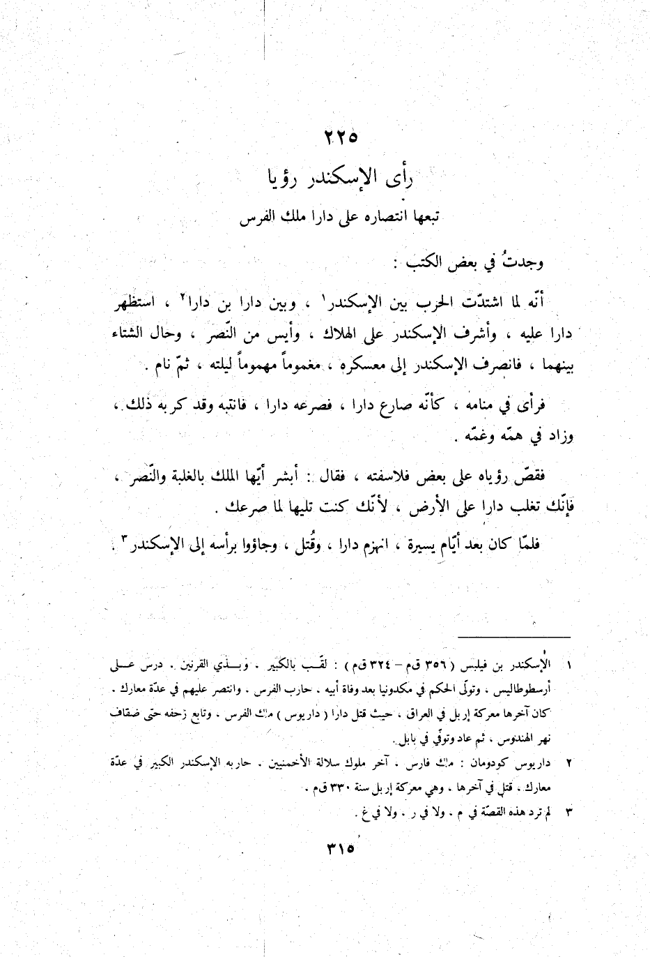 وجدت فِي بعض الْكتب: أَنه لما اشتدت الْحَرْب بَين الْإِسْكَنْدَر، وَبَين دَارا بن دَارا، استظهر دَارا عَلَيْهِ، وأشرف الْإِسْكَنْدَر على الْهَلَاك، وأيس من النَّصْر، وَحَال الشتَاء بَينهمَا، فَانْصَرف الْإِسْكَنْدَر إِلَى مُعَسْكَره، مغموما مهموما ليلته، ثمَّ نَام.