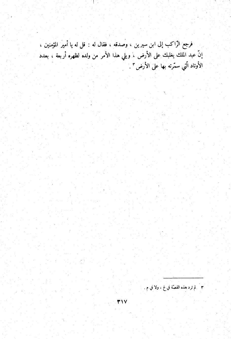 فَرجع الرَّاكِب إِلَى ابْن سِيرِين، وَصدقه، فَقَالَ لَهُ: قل لَهُ يَا أَمِير الْمُؤمنِينَ، إِن عبد الْملك يَغْلِبك على الأَرْض، ويلي هَذَا الْأَمر من وَلَده لظهره أَرْبَعَة، بِعَدَد الْأَوْتَاد الَّتِي سمرته بهَا على الأَرْض.