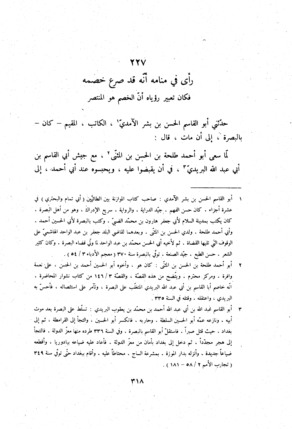 حَدثنِي أَبُو الْقَاسِم الْحسن بن بشر الْآمِدِيّ، الْكَاتِب، الْمُقِيم كَانَ بِالْبَصْرَةِ، إِلَى أَن مَاتَ، قَالَ: لما سعى أَبُو أَحْمد طَلْحَة بن الْحسن بن الْمثنى، مَعَ جَيش أبي الْقَاسِم بن أبي عبد الله البريدي، فِي أَن يقبضوا عَلَيْهِ، ويحبسوه عِنْد أبي أَحْمد، إِلَى