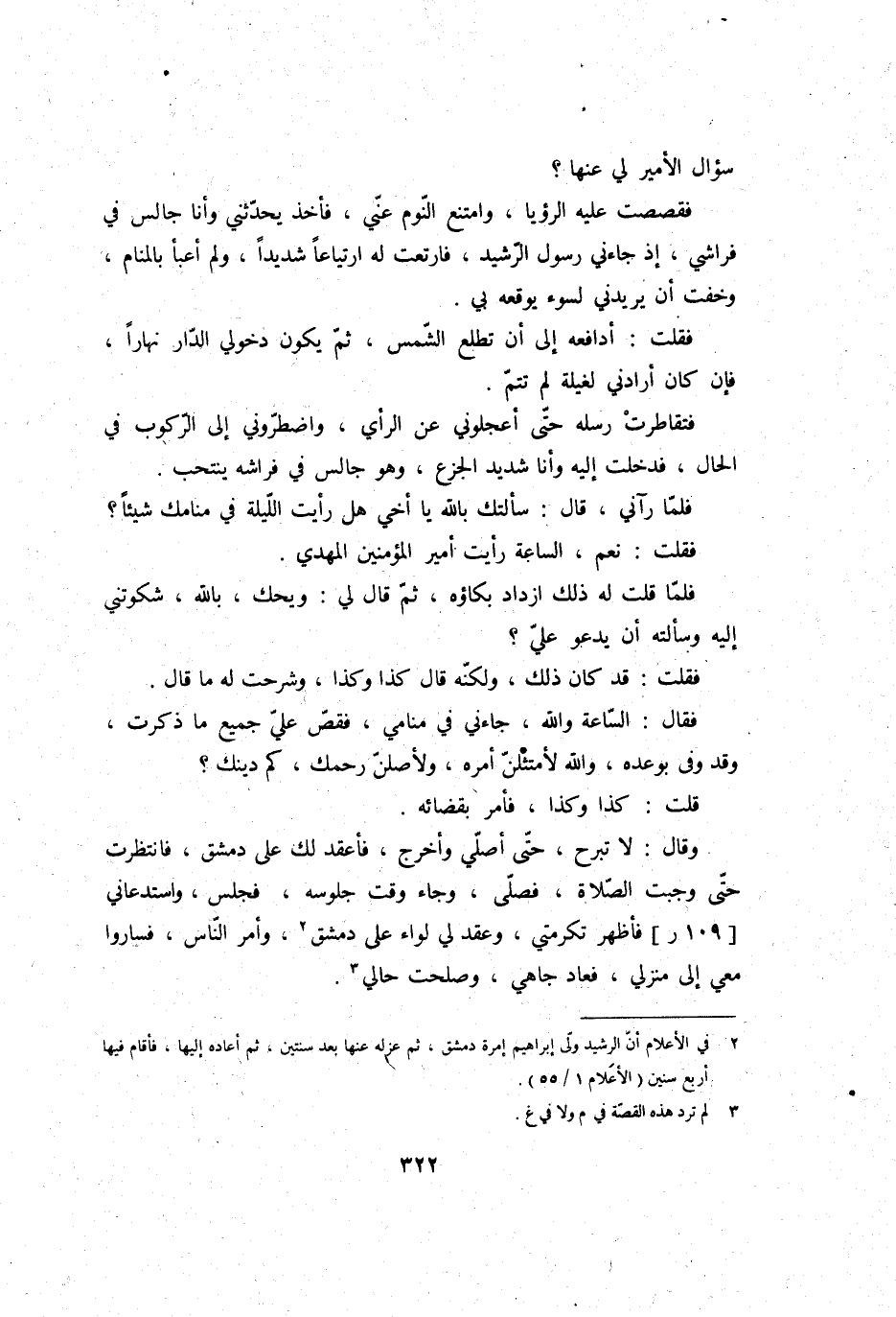 سُؤال الْأَمِير لي عَنْهَا؟ فقصصت عَلَيْهِ الرُّؤْيَا، وَامْتنع النّوم عني، فَأخذ يحدثني وَأَنا جَالس فِي فِرَاشِي، إِذْ جَاءَنِي رَسُول الرشيد، فارتعت لَهُ ارتياعا شَدِيدا، وَلم أعبأ بالمنام، وَخفت أَن يُرِيدنِي لسوء يوقعه بِي.