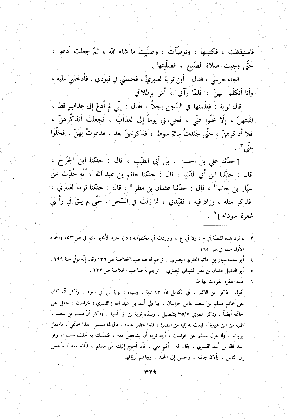 حَدثنَا عَليّ بن الْحسن بن أبي الطّيب، قَالَ: حَدثنَا ابْن الْجراح، قَالَ: حَدثنَا ابْن أبي الدُّنْيَا، قَالَ: حَدثنَا حَاتِم بن عبد الله، أَنه حدث عَن سيار بن حَاتِم، قَالَ: حَدثنَا عُثْمَان بن مطر، قَالَ: حَدثنَا تَوْبَة الْعَنْبَري، فَذكر مثله، وَزَاد فِيهِ، فقيدني، فَمَا زلت فِي السجْن، حَتَّى لم يبْق فِي رَأْسِي شَعْرَة سَوْدَاء.