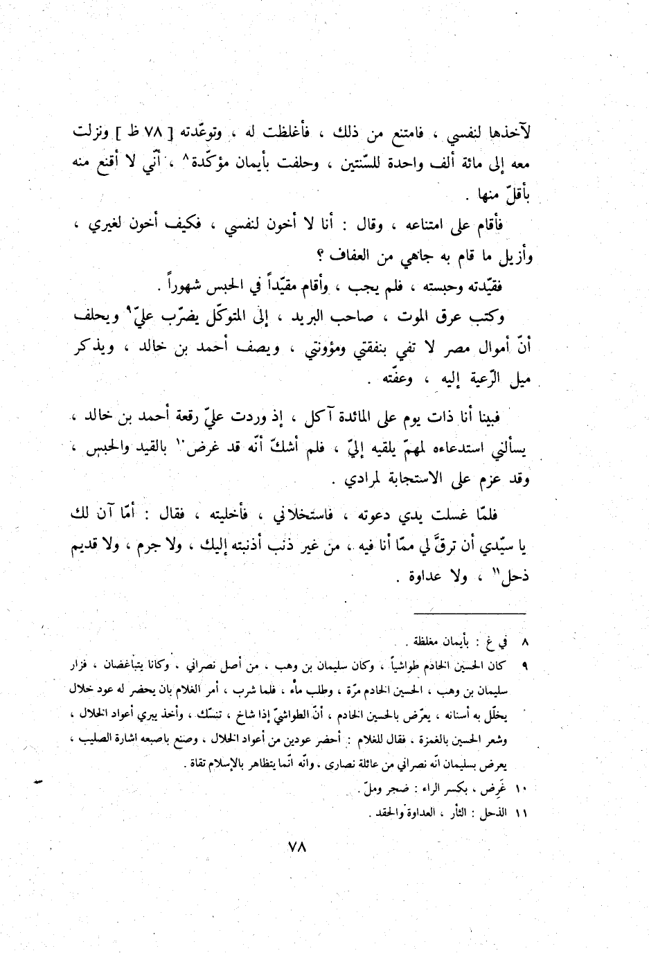 وَكتب عرق الْمَوْت، صَاحب الْبَرِيد، إِلَى المتَوَكل يضْرب عَليّ، وَيحلف أَن أَمْوَال مصر لَا تفي بنفقتي ومئونتي، ويصف أَحْمد بن خَالِد، وَيذكر ميل الرّعية إِلَيْهِ، وعفته.