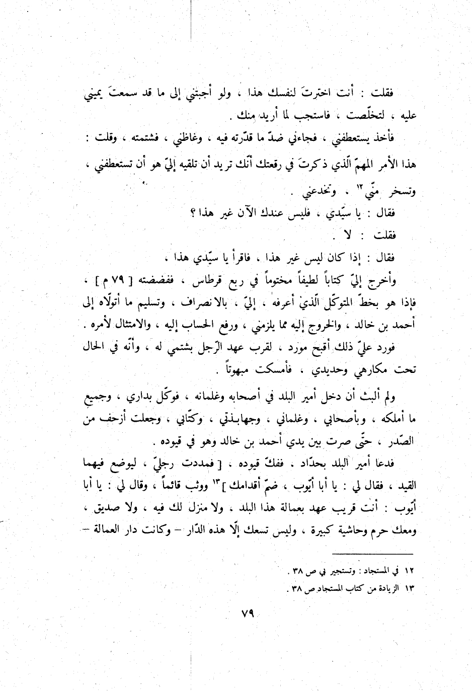 وَلم ألبث أَن دخل أَمِير الْبَلَد فِي أَصْحَابه وغلمانه، فَوكل بداري، وَجَمِيع مَا أملكهُ وبأصحابي وغلماني وجهابذتي، وكتابي، وَجعلت أزحف من الصَّدْر حَتَّى صرت بَين يَدي أَحْمد بن خَالِد، وَهُوَ فِي قيوده.