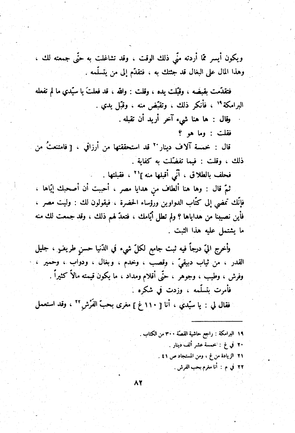 فتقدمت بِقَبْضِهِ، وَقبلت يَده، وَقلت: وَالله، قد فعلت يَا سَيِّدي مَا لم تَفْعَلهُ البرامكة، فَأنْكر ذَلِك، وتقبض مِنْهُ، وَقبل يَدي.