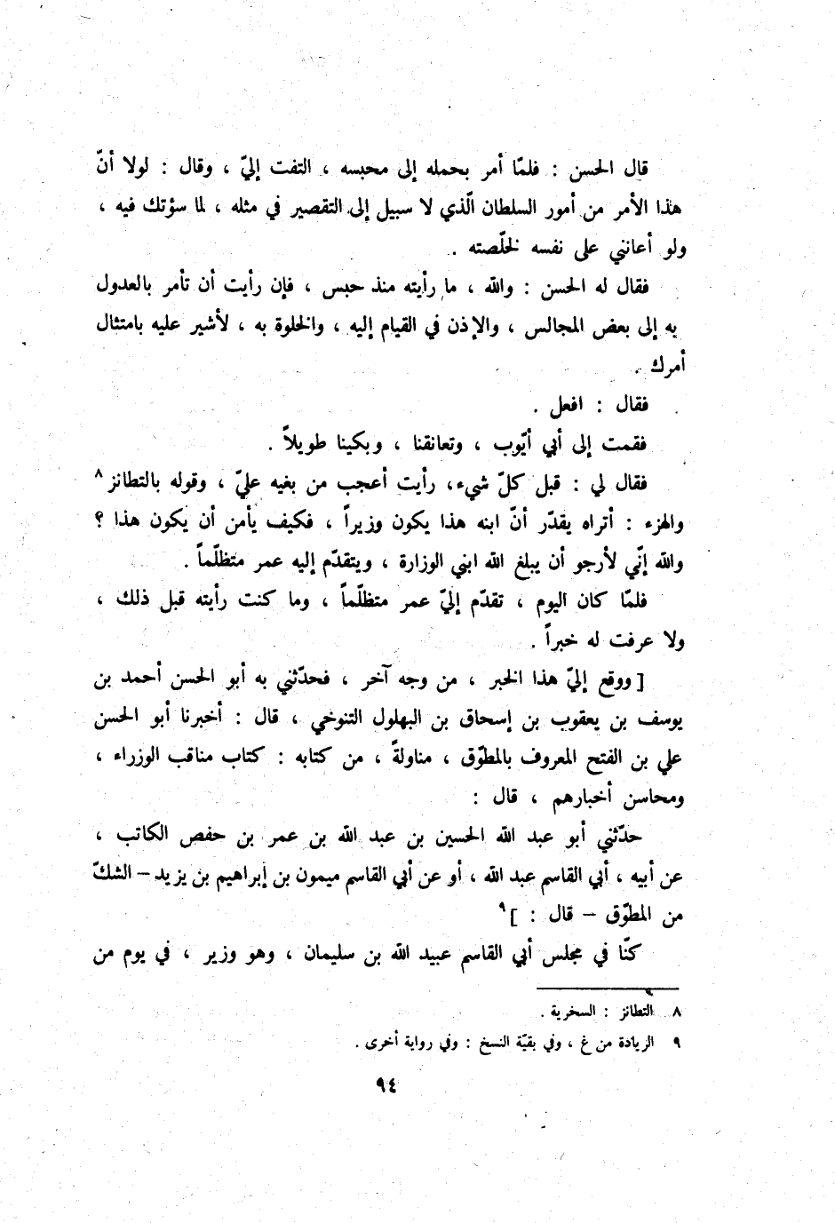وَوَقع إِلَيّ هَذَا الْخَبَر، من وَجه آخر، فَحَدثني بِهِ أَبُو الْحسن أَحْمد بن يُوسُف بن يَعْقُوب بن إِسْحَاق بن البهلول التنوخي، قَالَ: أخبرنَا أَبُو الْحسن عَليّ بن الْفَتْح الْمَعْرُوف بالمطوق، مناولة، من كِتَابه كتاب (مَنَاقِب الوزراء ومحاسن أخبارهم) ، قَالَ: حَدثنِي أَبُو عبد الله الْحُسَيْن بن عبد الله بن عمر بن حَفْص الْكَاتِب، عَن أَبِيه، أبي الْقَاسِم عبد الله، أَو عَن أبي الْقَاسِم مَيْمُون بن إِبْرَاهِيم بن يزِيد، الشَّك من المطوق، قَالَ: كُنَّا فِي مجْلِس أبي الْقَاسِم عبيد الله بن سُلَيْمَان، وَهُوَ وَزِير، فِي يَوْم من