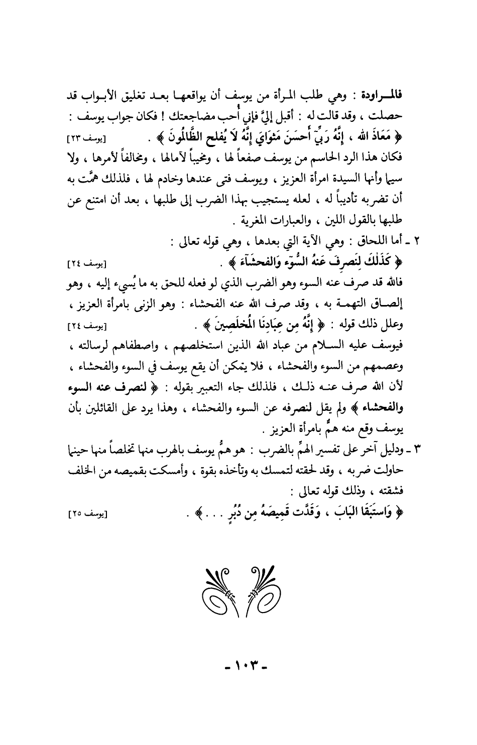 1 - التحذير من اختلاط الخدم والسواقين وغيرهم من الرجال بالنساء، وعدم الدخول عليهن، والخلوة معهن، لئلا يقع من النساء ما وقع لامرأة العزيز، ولا سيما عند غياب صاحب البيت، ومنع النساء من الاختلاط بالأجانب وخاصة العمال في البيوت والسواقين. . الخ.