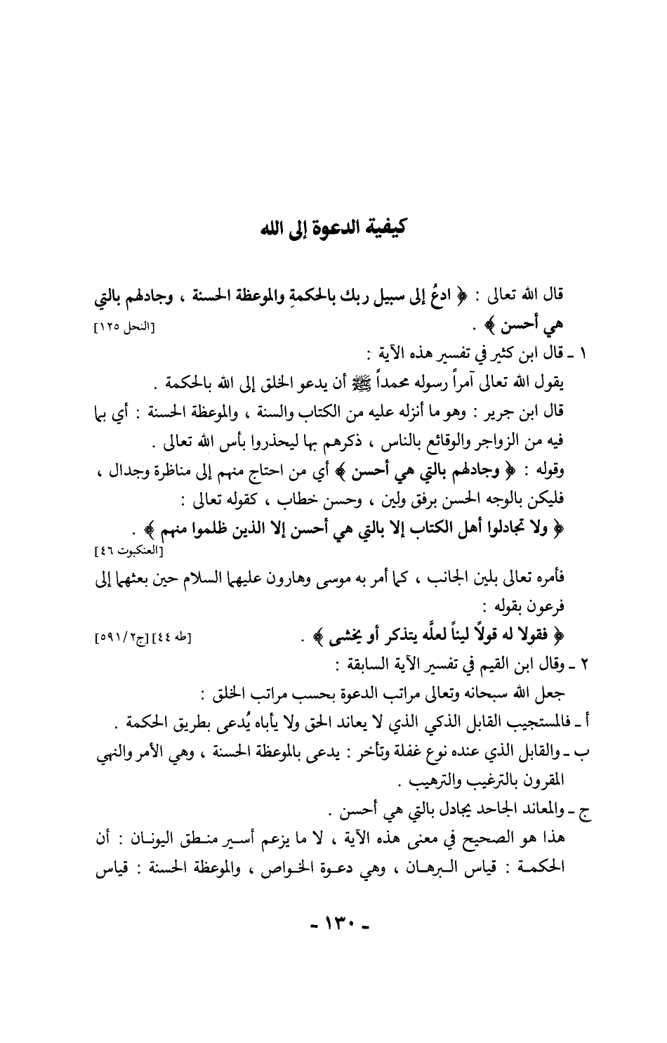 الخطابة، وهي دعوة العوام، وبالمجادلة بالتي هي أحسن: القياس الجدلي، وهو رد شغب المشاغب بقياس جدلي مسلَّم المقدمات. وهذا باطل، وهو مبني على أصول الفلسفة، وهو مناف لأصول المسلمين، وقواعد الدين من وجوه كثيرة ليس هذا موضع ذكرها. [مفتاح دار السعادة ج 1/ 193]