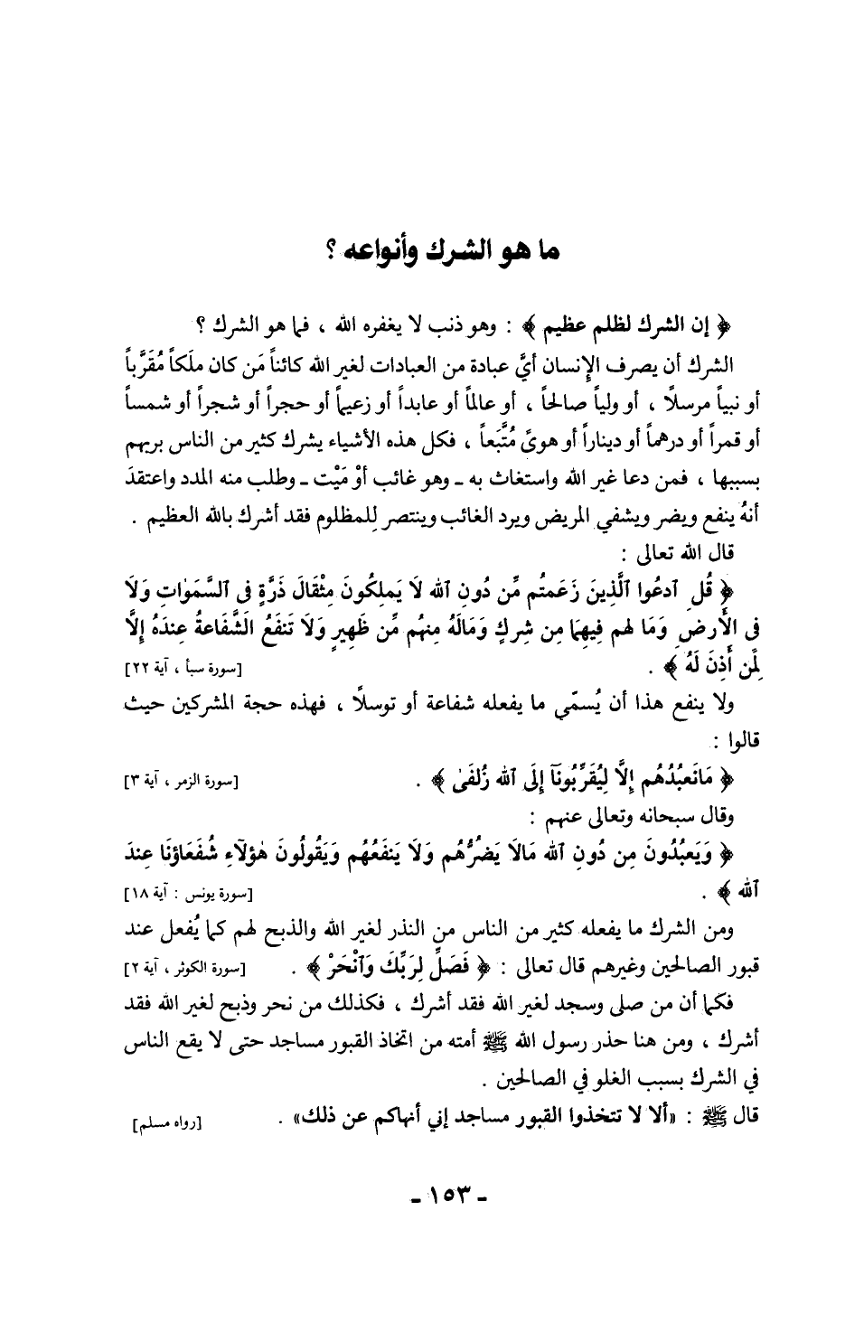 وأعلم يا أخي أن العلم بهذه الأشياء وحرمتها واجب على كل مسلم حتى يتجنب الوقوع في الشرك الأكبر والأصغر، فالشرك الأكبر هو الذي يُخلد صاحبه في النار. قال تعالى: {إِنَّ اللَّهَ لَا يَغْفِرُ أَنْ يُشْرَكَ بِهِ} [سورة النساء، آية 116]