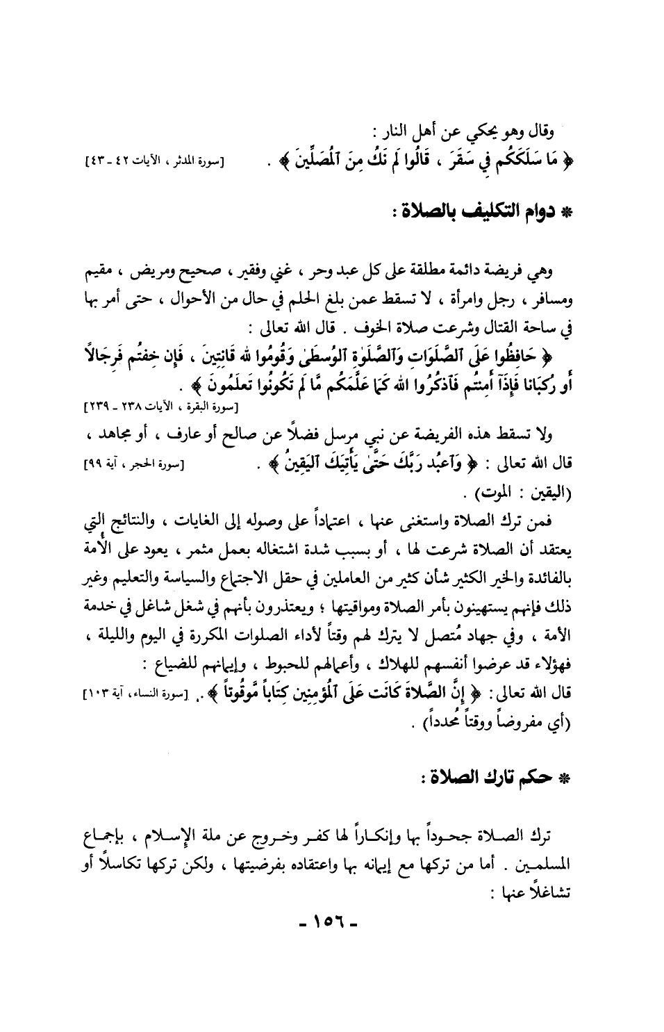 ولذلك داوم عليها الرسول - صلى الله عليه وسلم - وأصحابه مداومة شديدة، حتى كأنها جزء من الصلاة ولم يتركها في السلم ولا في الحرب ولا في مرضه الذي مات فيه، وقد كان الرسول - صلى الله عليه وسلم - شديد الإِنكار على من يتغيب عن الجماعة ولا يشهد الصلاة مع المسلمين.