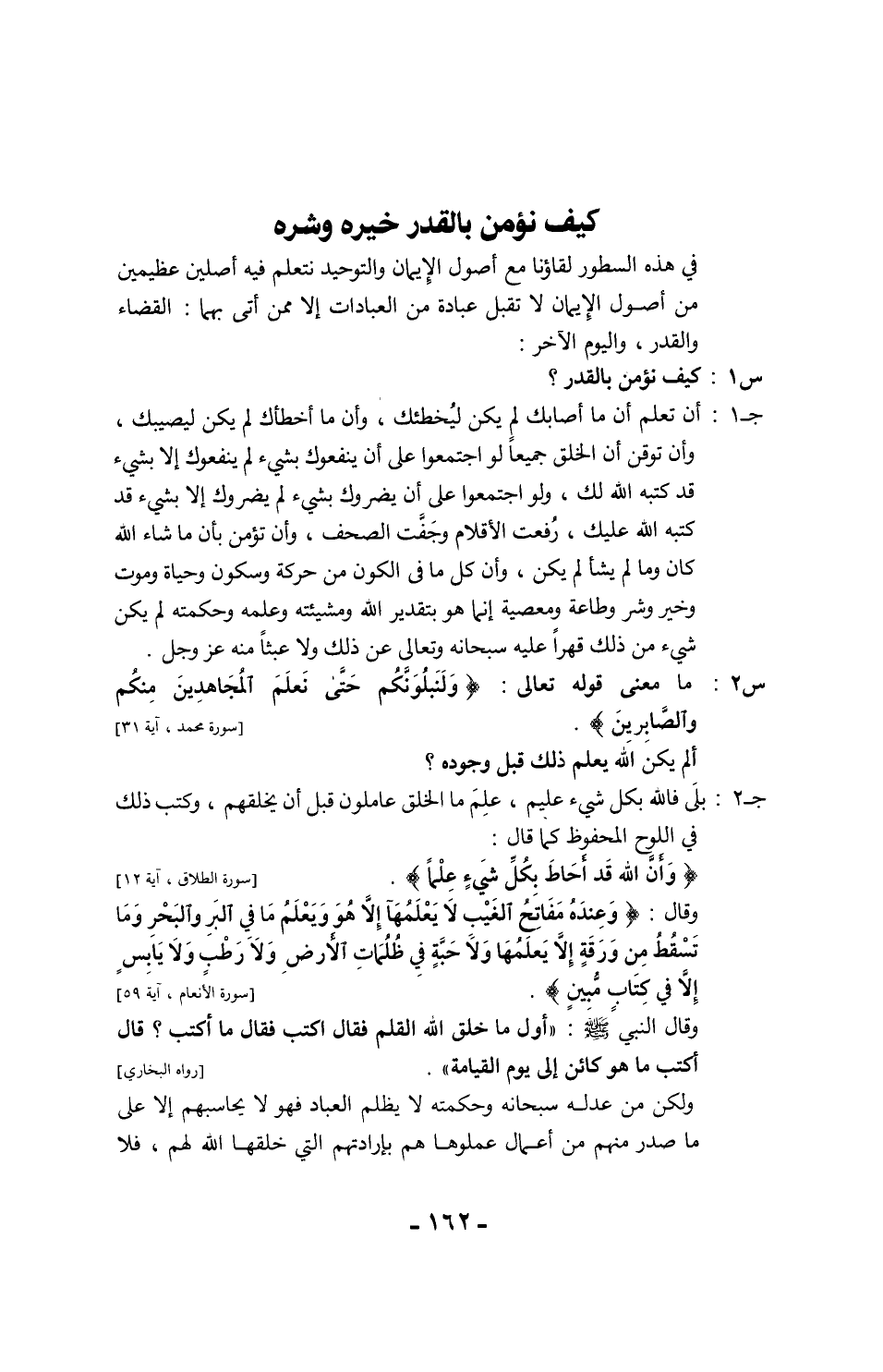 وهذا التقييد لا يعني إلغاء إرادته وأنه مُسَير أو مجبور بلا اختيار، بل لا يحاسب الله أحداً فقد إرادته كالمكره والمجنون والنائم، ولكن مشيئة الله تجري على العباد من خلال ما يعلمونه هم بأنفسهم وقدرتهم، والله خالقهم وخالق قدرتهم وإرادتهم وأفعالهِم، أما الأفعال غير الاختيارية كنبض القلب والانجذاب إلى الأرض مثلًا فلا خلاف أن العبد لا قدرة له عليها ولا اختيار. س 4: إذا كان الله هو الذي شاء وجود الخير والشر وهو الذي خلقهما فهل يرضى عن الشر ويُحب أن يُعْصَى؟.