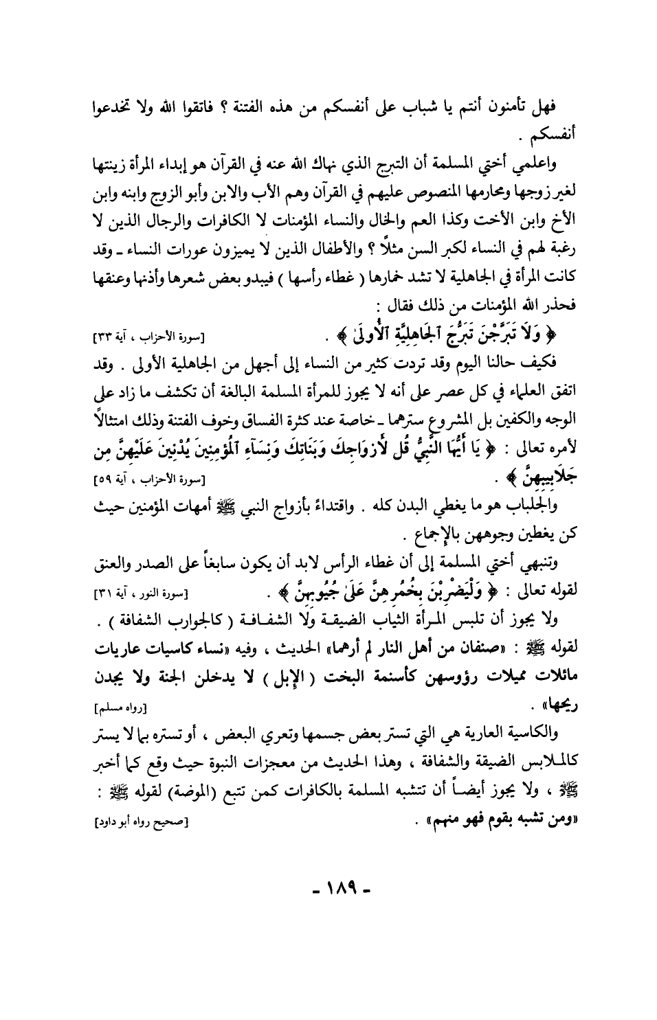 ولا يجوز أن يكون الثوب زينة في نفسه ولا ثوب شهرة يلفت الأنظار لمنافاة ذلك لقصود التستر - ويجب علينا أن ننبه هنا على حُرمة خلوة الرجل بالمرأة الأجنبية من غير ذي محرم معها لقوله - صلى الله عليه وسلم -: "لا يخلُون رجل بامرأة إلا مع ذي محرم". [رواه البخاري]