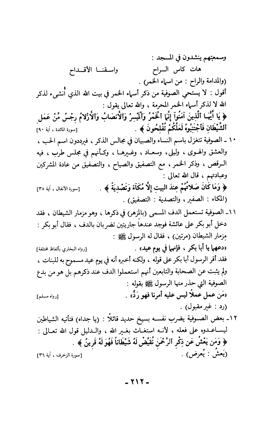 13 - الصوفية لها طرق كثيرة كالتيجانية، والشاذلية، والنقشبندية، وغيرها، والِإسلام له طريق واحد فقط، والدليل حديث ابن مسعود -رضي الله عنه- حين قال: خط لنا رسول الله - صلى الله عليه وسلم - خطًا بيده، ثم قال: "هذا سبيل الله مستقيمًا"، وخط خطوطًا عن يمينه وشماله، ثم قال: "هذه السُّبل، ليس منها سبيل إلا عليه شيطان يدعو إليه"، ثم قرأ قوله تعالى: