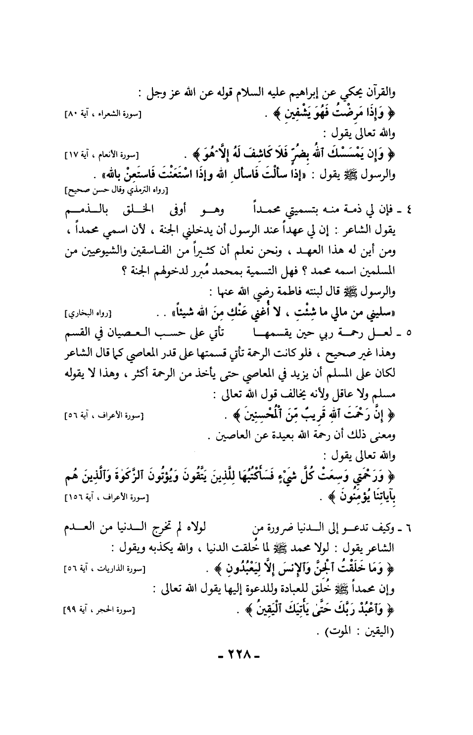 فاحذر يا أخي المسلم قراءة هذه القصيدة وأمثالها المخالفة للقرآن، وهدي الرسول عليه الصلاة والسلام. والعجيب أن في بعض بلاد المسلمين من يُشَيِّع بها موتاهم إلى القبور، فيضمون إلى هذه الضلالات بدعة أخرى حيث أمر بالصمت عند تشييع الجنائز ولا حول ولا قوة إلا بالله العلي العظيم.