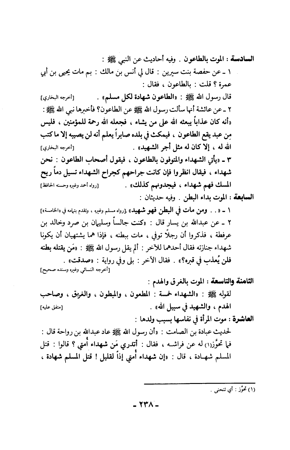 "الشهداء سبعة سوى القتل في سبيل الله: المطعون شهيد، والغرق شهيد، وصاحب ذات الجنب شهيد، والمبطون شهيد، والحرق شهيد، والذى يموت تحت الهدم شهيد، والمرأة تموت بُجُمع (¬3) شهيدة".