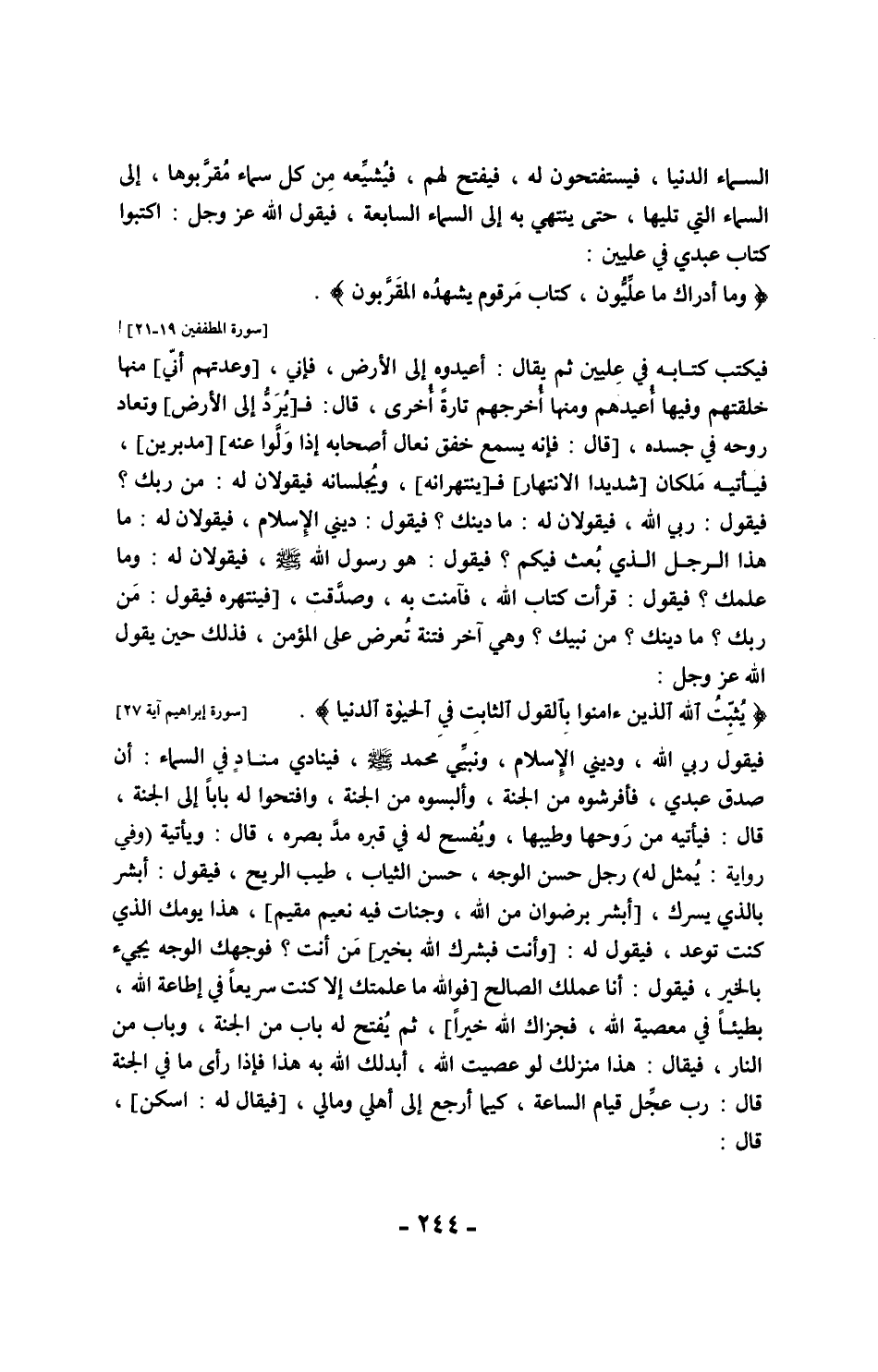 فيقول الله -عَزَّ وَجَلَّ-: اكتبوا كتابه في سجين، في الأرض السفلى، [ثم يقال: أعيدوا عبدي إلى الأرض فإني وعدتهم أني منها خلقتهم، وفيها أُعيدهم، ومنها أُخرجهم تارة أخرى] فتُطرَح روحه [من السماء] طرحاً [حتى تقع في جسده] ثم قرأ:
