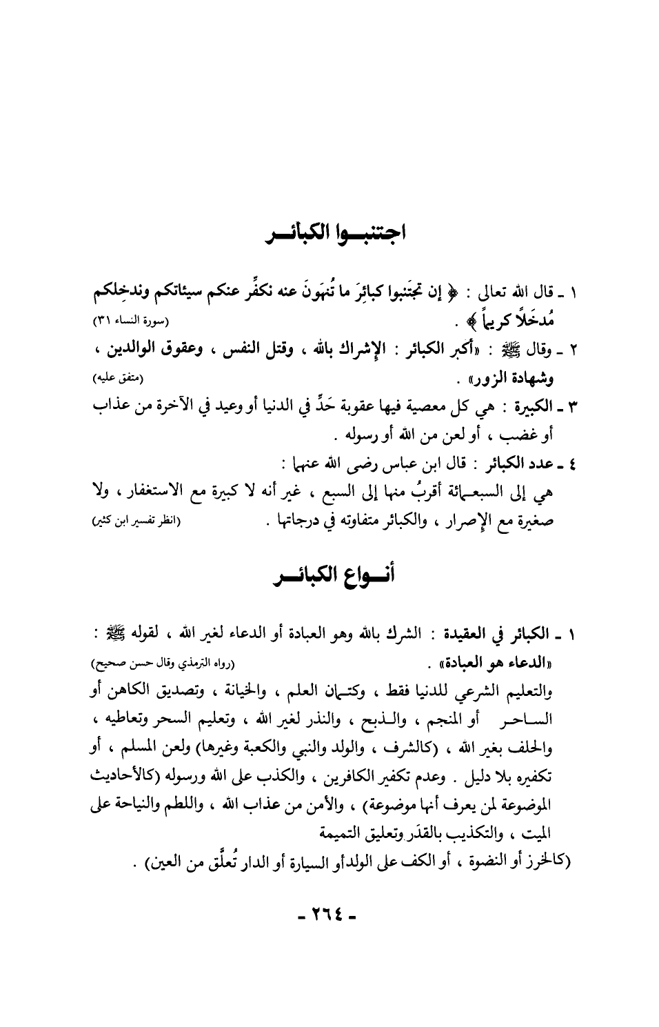 5 - الكبائر في الأسرة والنسب: الزنا، واللواط (إتيان الذكور)، وقذف المحصنات المؤمنات (الطعن في أعراضهن)، وتبرج المرأة، وإظهار شعرها، وتشبه النساء بالرجال، والرجال بالنساء، (كحلق اللحية)، وعقوق الوالدين (عدم إطاعتهما في غير معصية)، وهجر الأقارب من غير سبب مشروع، وعصيان المرأة زوجها في
