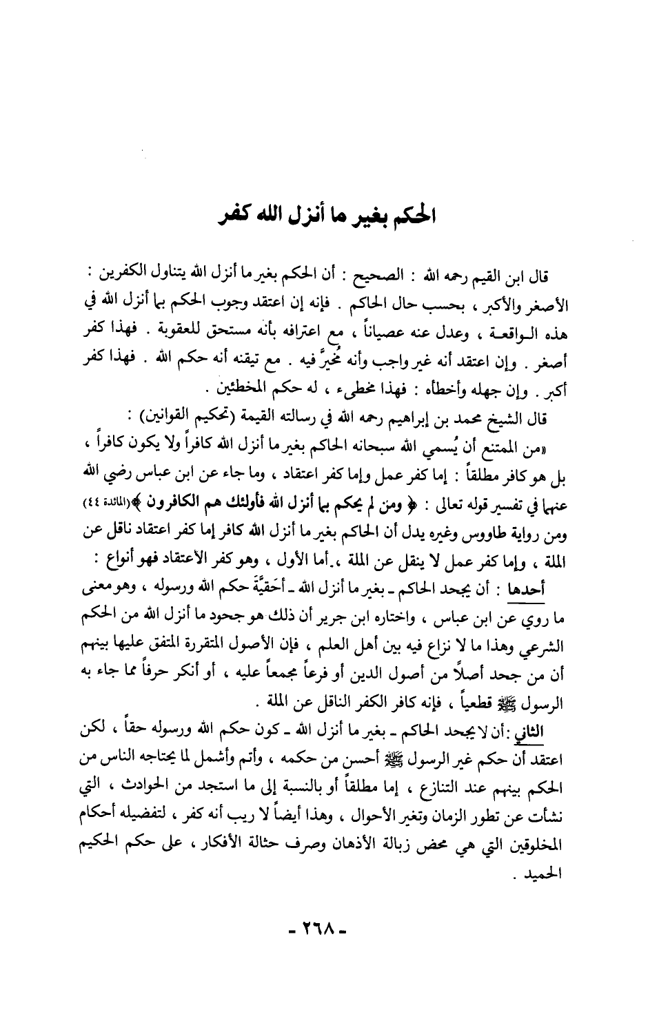 الثالث: أن لا يعتقد كونه أحسن من حكم الله ورسوله، لكن اعتقد أنه مثله، فهذا كالنوعين اللذين قبله، وفي كونه كافراً الكفر الناقل عن الملة، لما يقتضيه ذلك من تسوية المخلوق بالخالق، والمناقضة والمعاندة لقوله -عَزَّ وَجَلَّ-: {لَيْسَ كَمِثْلِهِ شَيْءٌ} ونحوها من الآيات الكريمة الدالة على تفرد الرب بالكمال، وتنزيهه عن مماثلة المخلوقين، في الذات والصفات والأفعال، والحكم بين الناس فيما يتنازعون فيه.