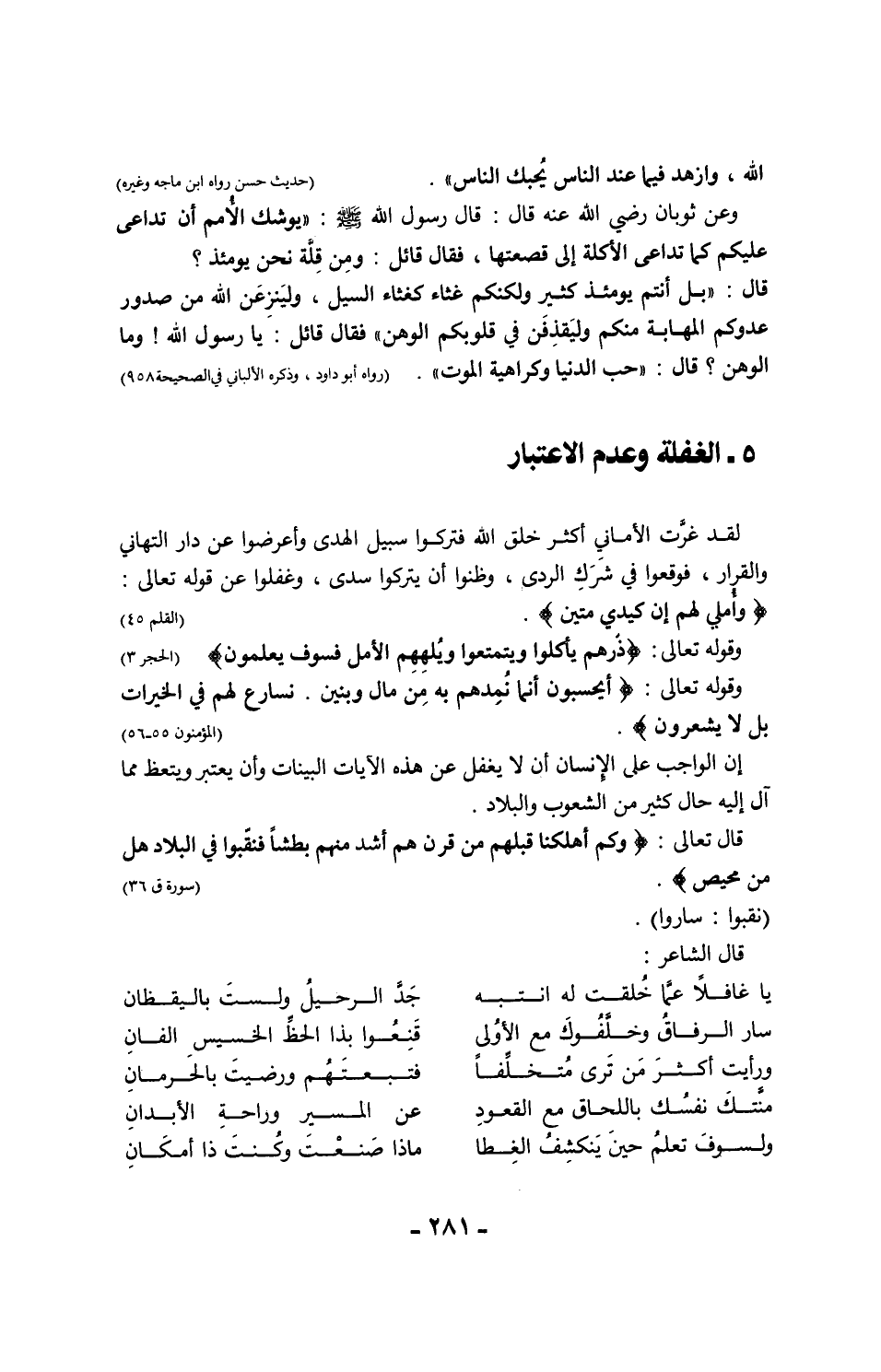 1 - قال رسول الله - صلى الله عليه وسلم -: "ستكون فتن، القاعد فيها خير من القائم، والقائم فيها خير من الماشي، والماشي فيها خير من الساعي، من تشرَّف لها تسشرفه، ومن وجد ملجأ أو معاذاً فليَعُذ به". (رواه البخاري ومسلم)