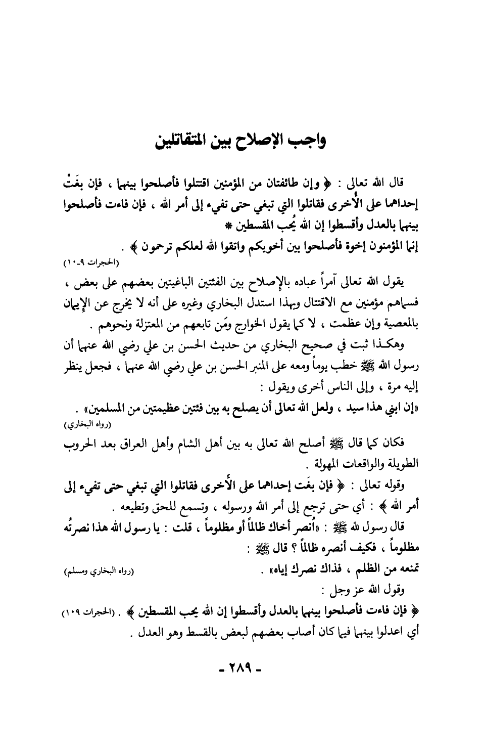 ولقد وجد الرسول - صلى الله عليه وسلم - سكان المدينة، وهم من الأوس والخزرج بينهم عداوة قديمة، فأصلح بينهم، وأزال الحقد والعداوة من صدورهم، وجعلهم إخوة متحابين في الإِيمان والتوحيد كما جاء في الحديث: "المسلم أخو المسلم" [رواه مسلم]