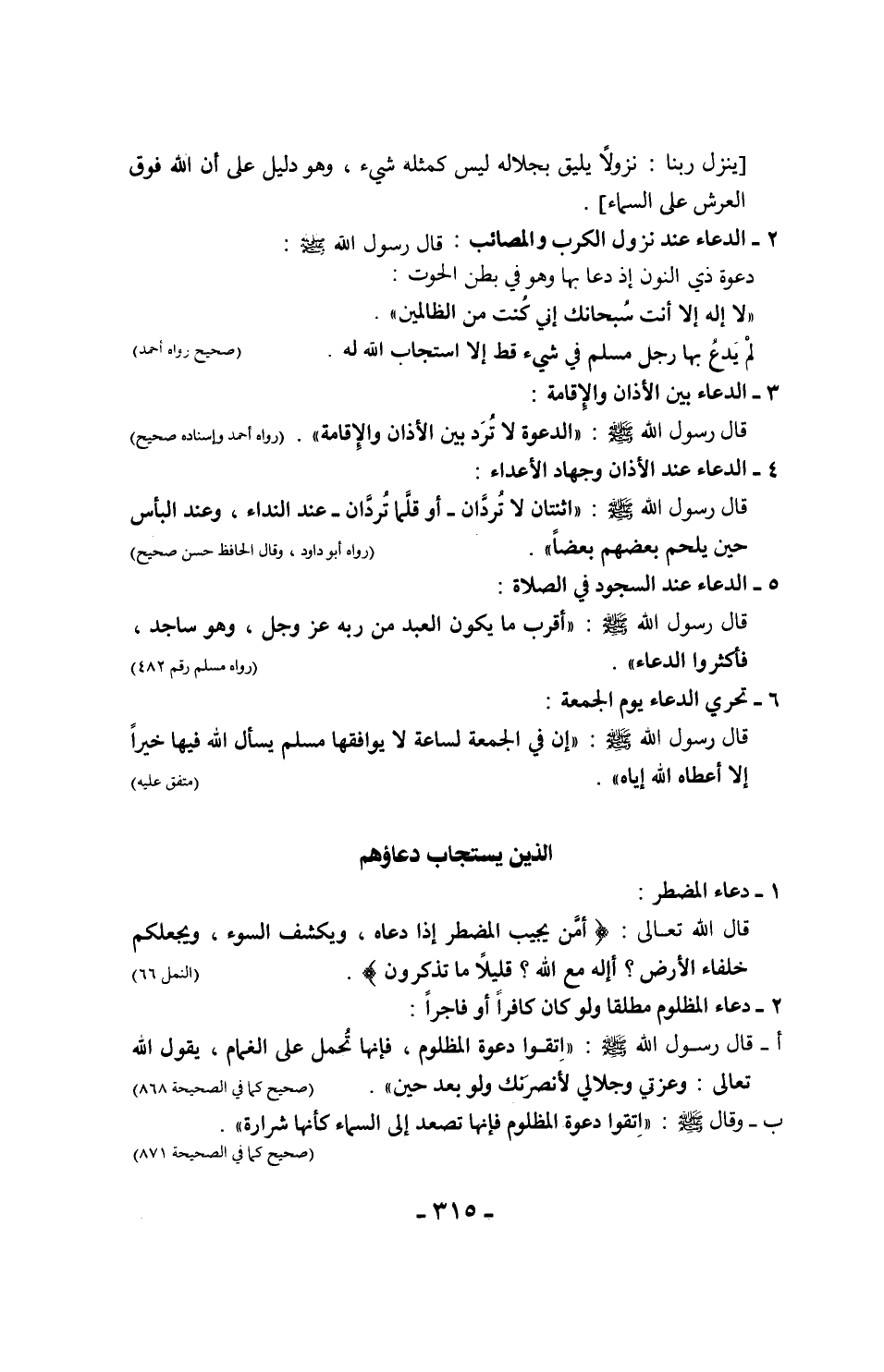 ب - وقال - صلى الله عليه وسلم -: "ثلاث دعوات مستجابات ولا شك فيهن: دعوة الوالد، ودعوة المسافر، ودعوة المظلوم". (حسنه الألباني في الصحيحة 596)