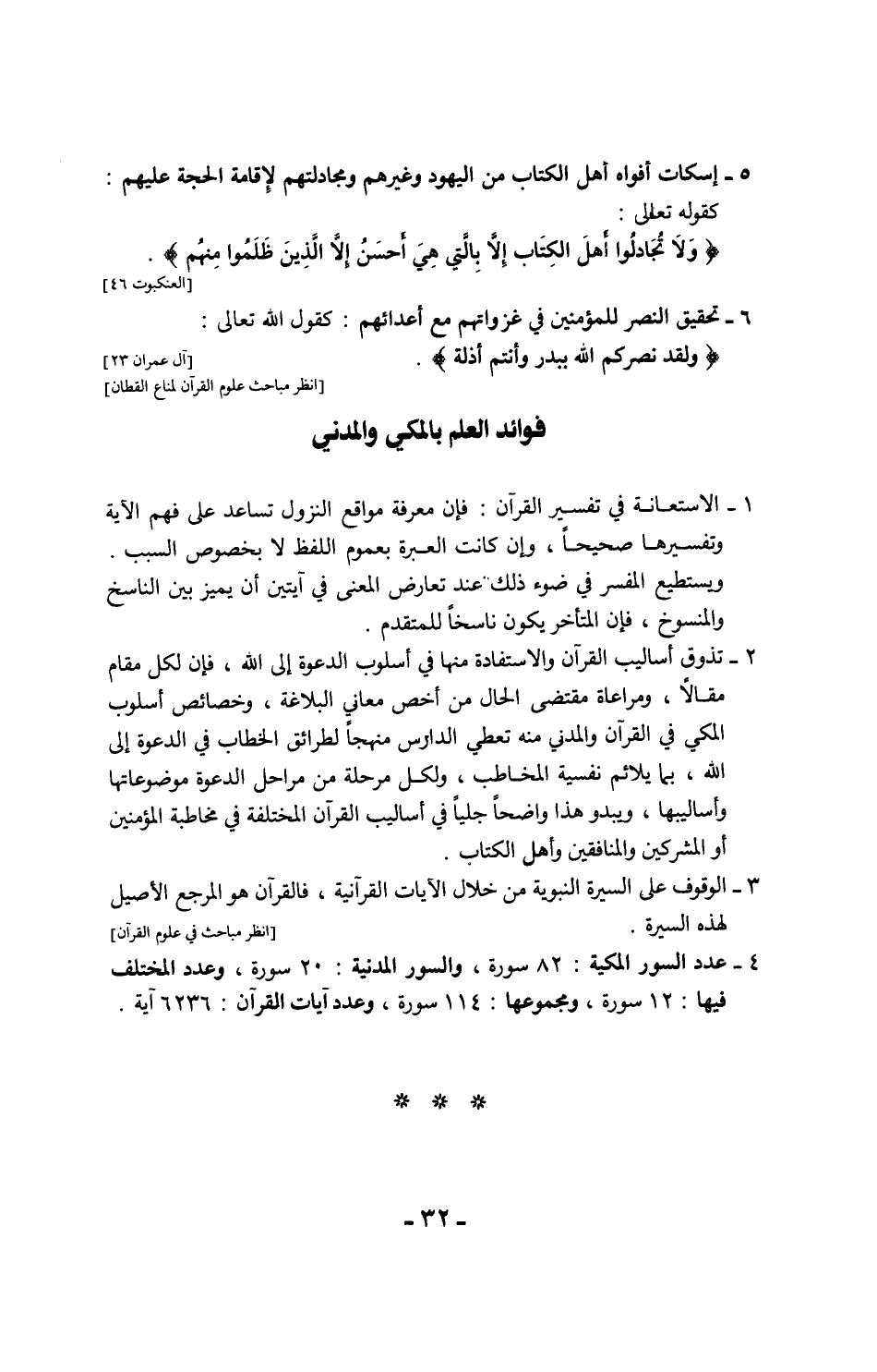 الآيات المكية في السور المدنية: لا يقصد بوصف السورة بأنها مكية أو مدنية أنها بأجمعها كذلك فقد يكون في المكية بعض آيات مدنية، وفي المدنية بعض آيات مكية، ولكنه وصف أغلبي حسب أكثر آياتها، ولذا يأتي في التسمية: سورة كذا مكية إلا آية كذا فإنها مدنية، وسورة كذا مدنية إلا آية كذا فإنها مكية، كما نجد ذلك في المصاحف -ومن أمثلة الآيات المكية في السور المدنية "سورة الأنفال مدنية" واستثنى منها كثير من العلماء قوله تعالى: