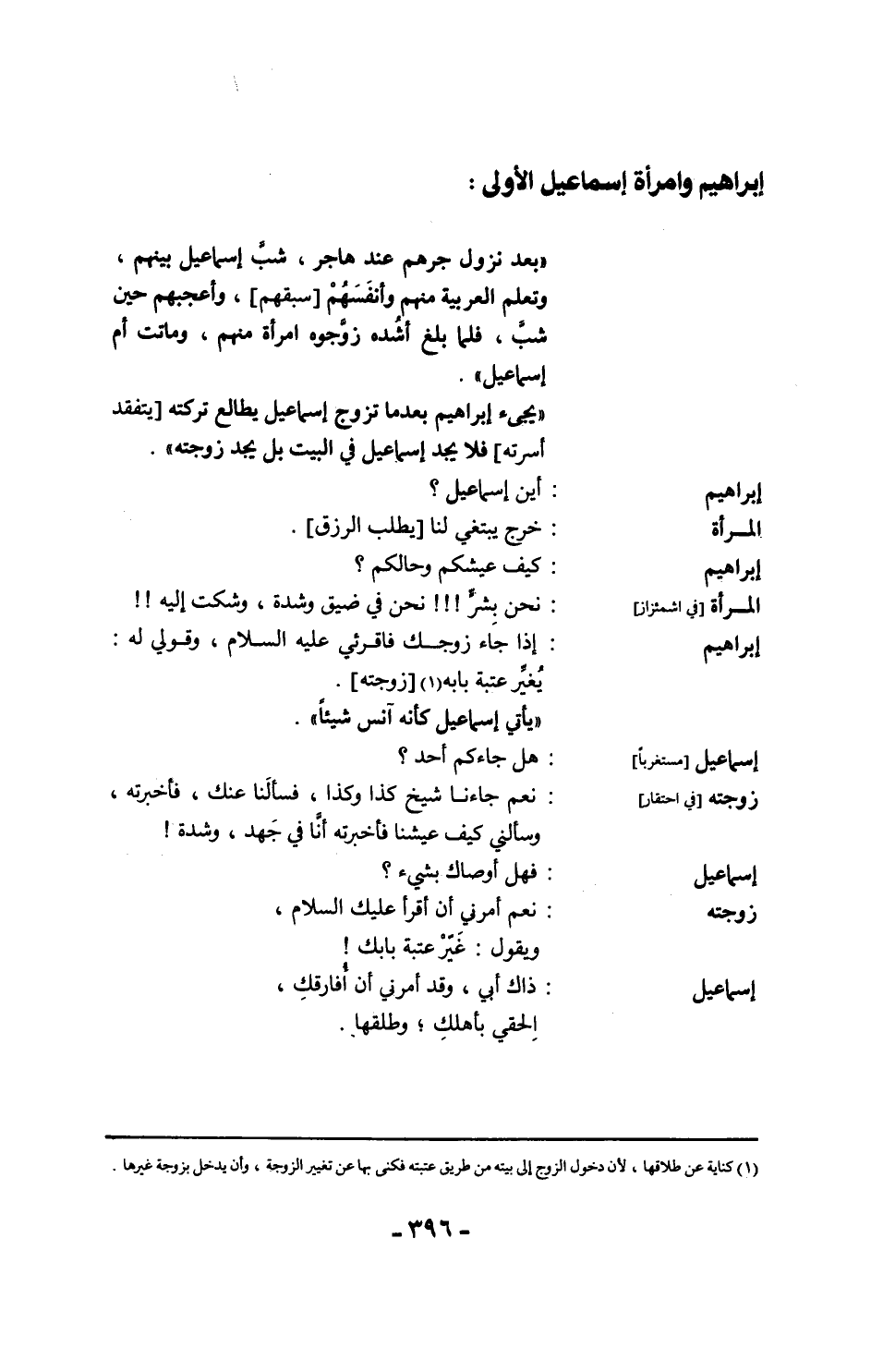 إبراهيم: اللهم بارك لهم في اللحم والماء، فإذا جاء زوجك فاقرئي -عليه السلام- ومُريه [يُثَبِت عتبة بابه].