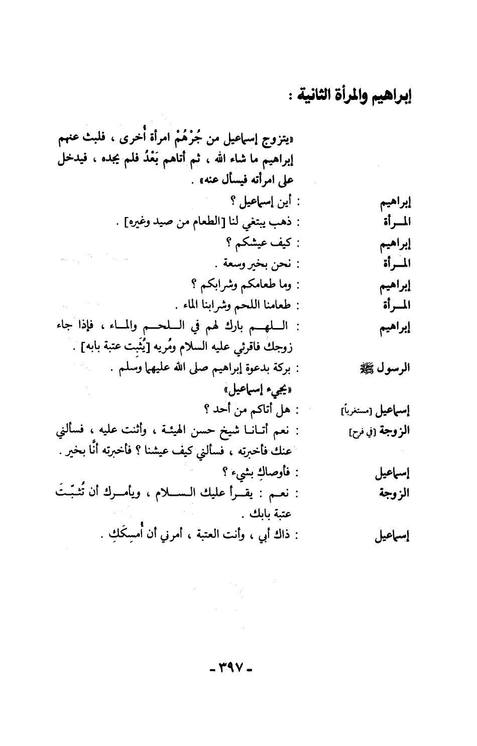 "يلبث إبراهيم عنهم ما شاء الله، ثم يجيء بعد ذلك وإسماعيل يَبري نبلًا له تحت دوحة [شجرة] قريبة من زمزم يراه إسماعيل فيقوم إليه ويتعانقان".