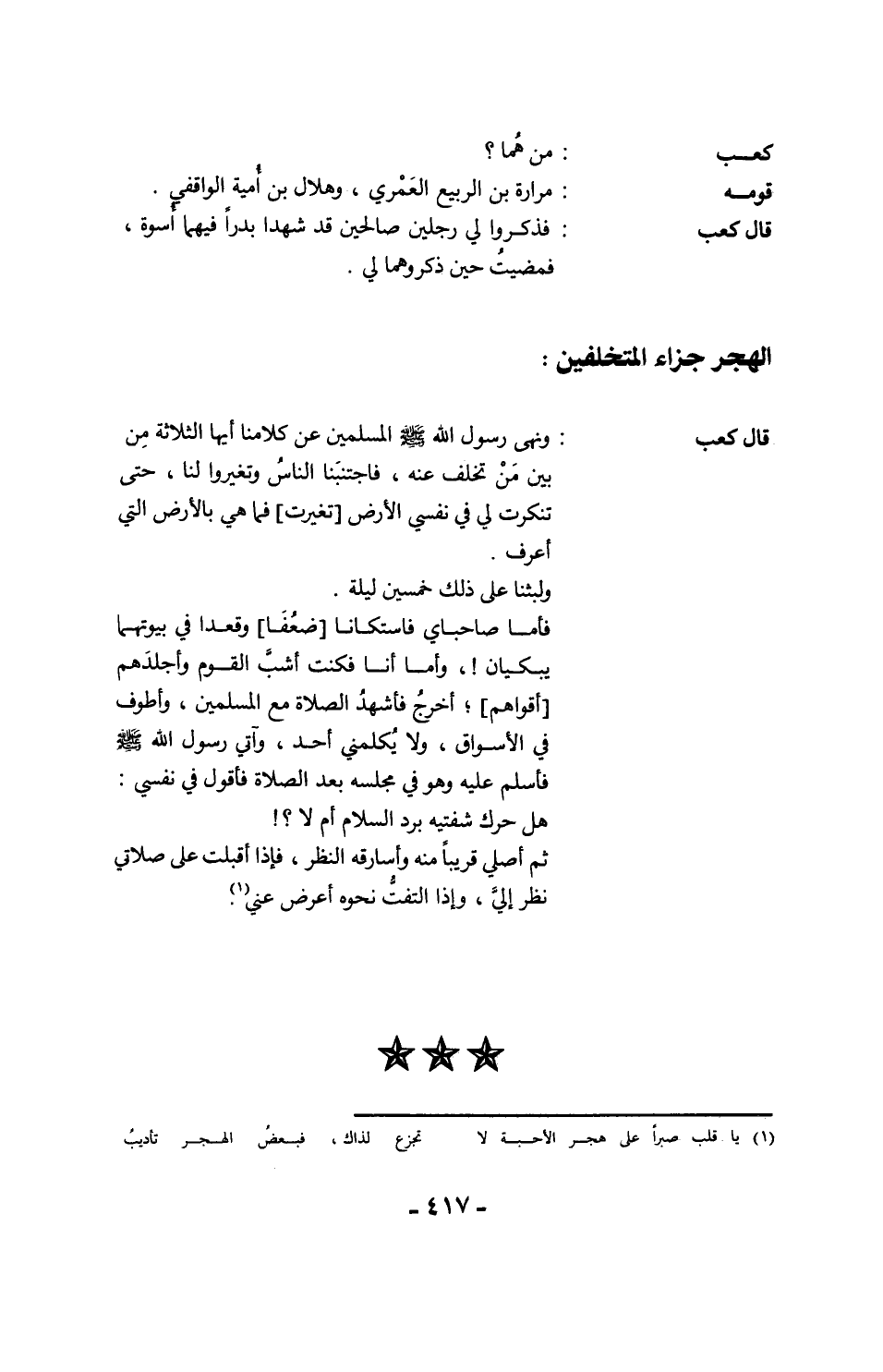 قال كعب: حتى إذا طال ذلك عليَّ من جفوة المسلمين مشيتُ حتى تسوَّرتُ جدار حائط أبي قتادة [بستانه] وهو ابن عمي وأحبُّ الناس إليَّ، فسلمتُ عليه فوالله ما رَدَّ عليَّ السلام.
