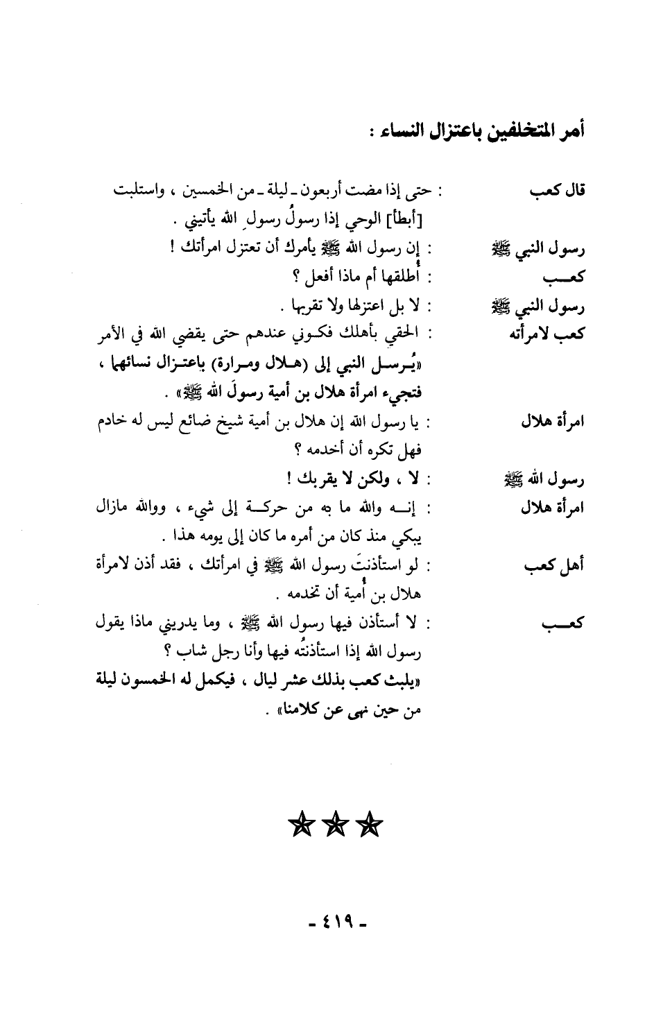 قال كعب: فلما جاءني الذي سمعتُ صوته يبشرني نزعت له ثَوبيَّ فكسوتهم إياه ببشارته -والله ما أملك غيرَهما يومئذٍ- واستعرتُ ثوبين ولبستهما؛ وانطلقتُ أتأمم [أقصد] رسول الله - صلى الله عليه وسلم - فتلقاني الناس فوجًا فوجًا يُهنئوني بالتوبة ويقولون: لِتَهنِكَ توبة الله عليك، حتى إذا دخلت المسجد فإذا رسول الله - صلى الله عليه وسلم - جالس حوله الناس فقام طلحة بن عبيد الله يُهرول حتى صافحني وهنأني، والله ما قام رجل من المهاجرين غيره إ! فكان كَعب لا ينساها لطلحة.