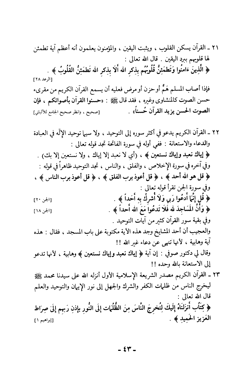 24 - القرآنَ الكريم يخبر عن الحوادث المستقبلة التي لا تُعلَم إلا بالوحي كقوله تعالى: {سَيُهزَمُ الجَمعُ وَيُوَلُّونَ الدُّبُرَ}. [القمر: 45]