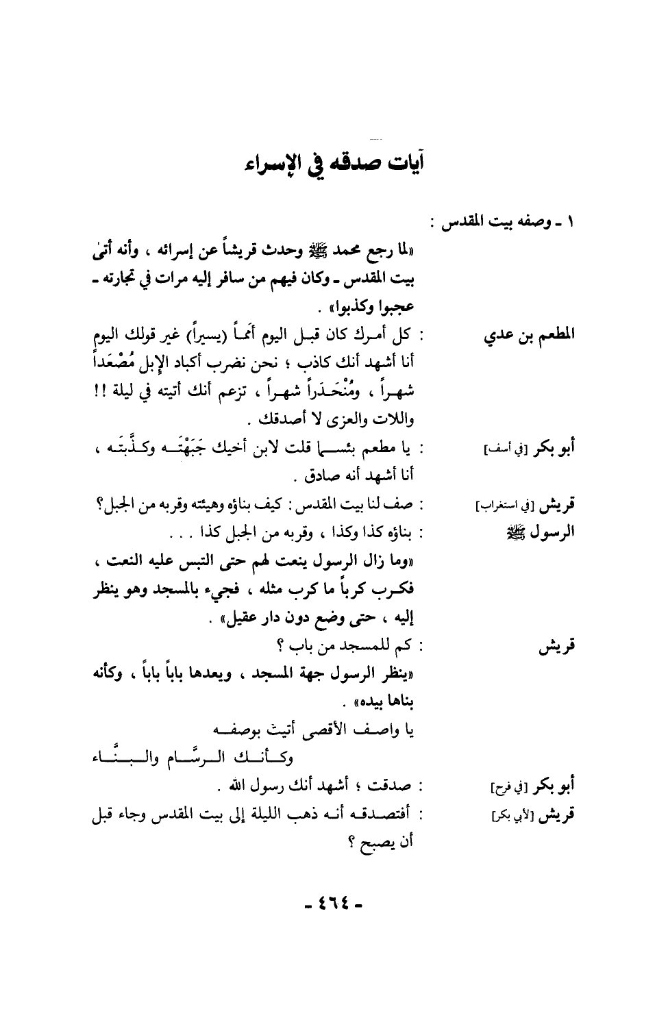 الرسول - صلى الله عليه وسلم -: أتيت على عير بني فلان (قافلتهم) بالروحاء قد أضلوا ناقة لهم، فانطلقوا في طلبها، فانتهيت إلى رحالهم فليس بها منهم أحد، وإذا قَدَحُ ماءٍ فشربت منه، ثم انتهيت إلى عير بني فلان فيها جمل عليه غِرارتان (عِدلان) غِرارة سوداء وغرارة بيضاء، فلما حاذيتُ العير نفرت، وضرِع ذلك البعير وانكسر.