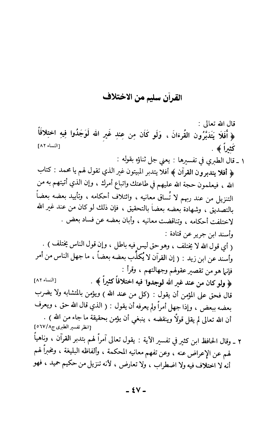 3 - وقال الشاطبي وإذا ثبت أن القرآن في نفسه لا اختلاف فيه، صح أن يكون حكماً بين جميع المختلفين، لأنه إنما يقرر معنى هو الحق، والحق لا يختلف في نفسه، فكل اختلاف صدر من المكلفين فالقرآن هو المهيمن عليه، قال الله تعالى: