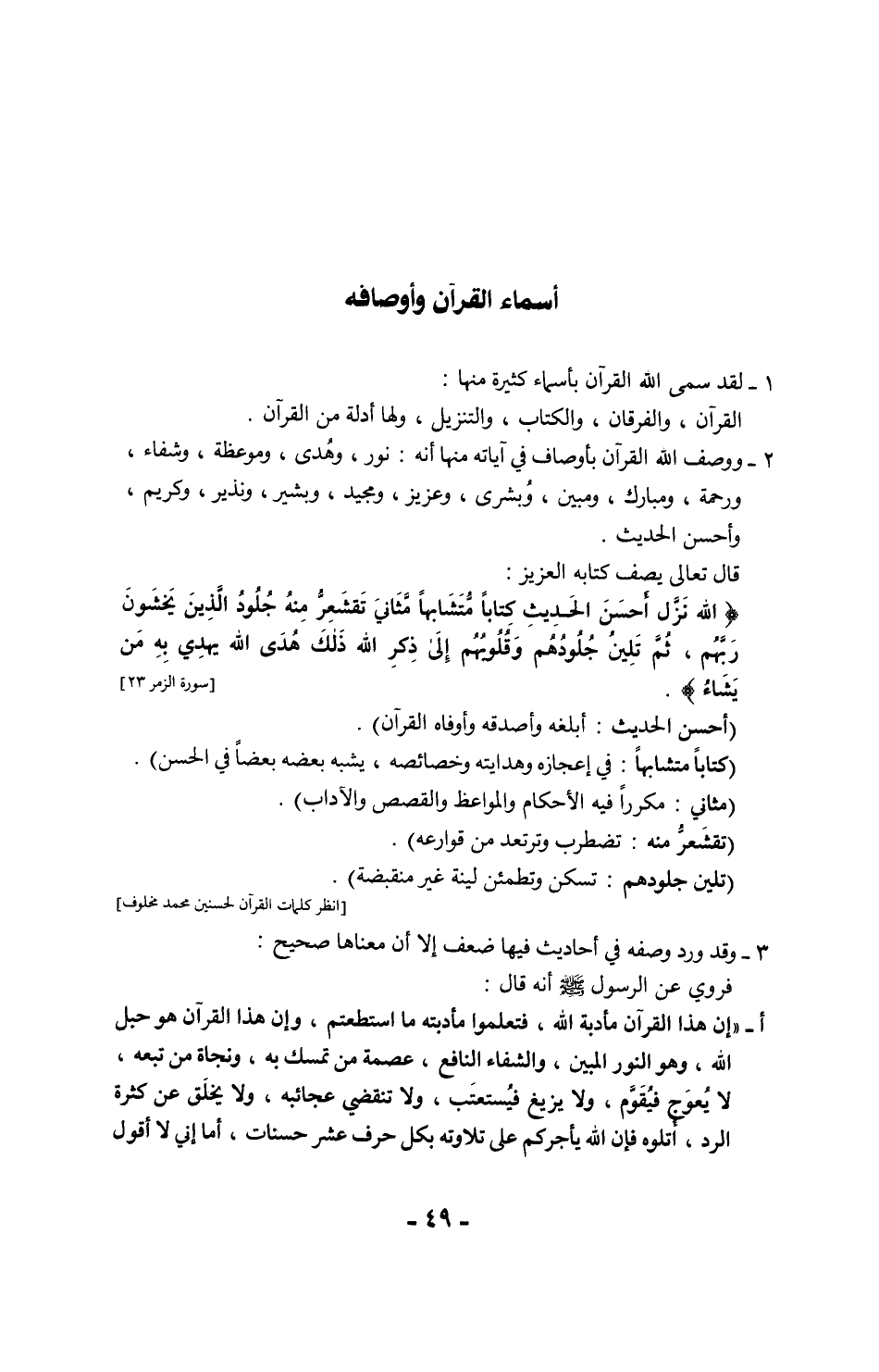 ب - "ألا إنها ستكون فتن، قلت وما المخرج منها؟ قال: كتاب الله، كتاب الله، فيه نبأ ما قبلكم وخبر ما بعدكم وحكم ما بينكم، وهو الفصل ليس بالهزل، وهو الذي من تركه من جبار قصمه الله، ومن ابتغى الهدى في غيره أضله الله، فهو حبل الله المتين، وهو الذكر الحكيم، وهو الصراط المستقيم، وهو الذي لا تزيغ به الأهواء ولا تلتبس به الألسن، ولا يشبع منه العلماء، ولا يخلَق عن كثرة الرد، ولا تنقضي عجائبه. وهو الذي لم تَنتهِ الجن إذ سمعته أن قالوا: {إِنَّا سَمِعْنَا قُرْآنًا عَجَبًا} [الجن: 1]