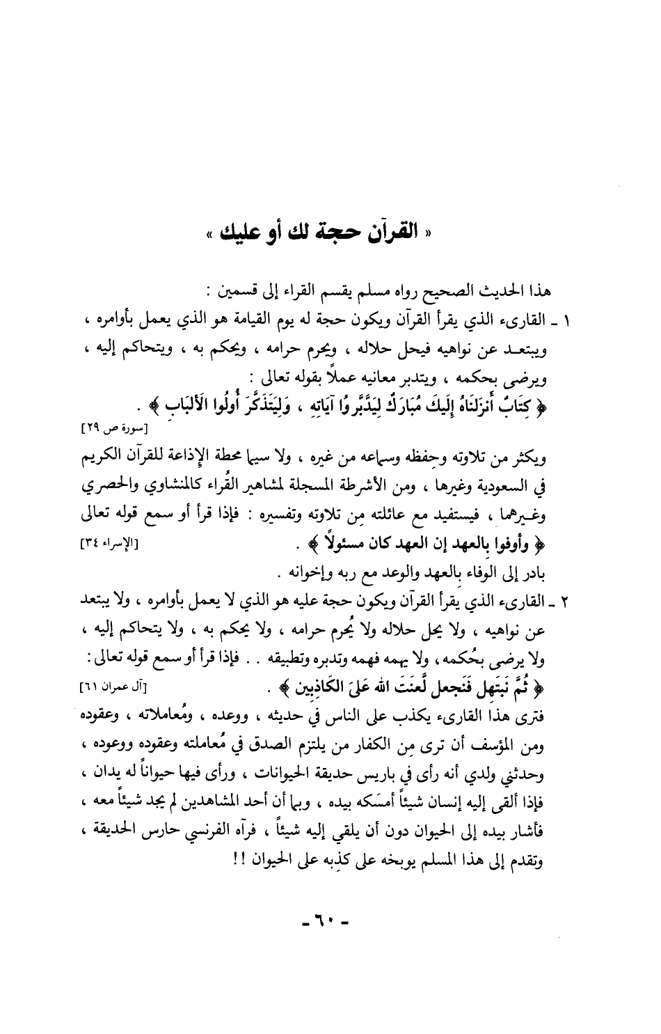 فعليك يا أخي المسلم أن تعمل بما تقرأ وتسمع حتى يكون القرآن حجة لك لا عليك، ولا سيما حفظة القرآن والمشتغلين بعلومه وتفسيره، فكثيراً من حفظة القرآن ومفسريه لا يتقيدون بتعاليمه وآدابه.