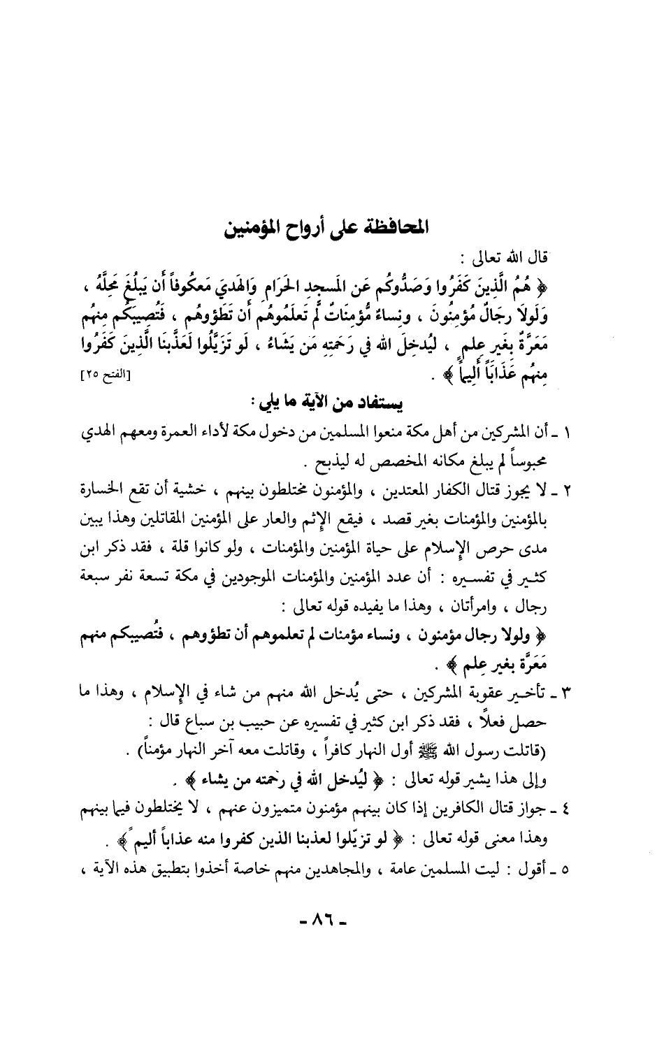 وراعَوا وجود إخوان لهم من المسلمين والمسلمات مختلطين بين الذين يريدون قتالهم، ولو أنهم أخروا قتالهم -كما آخر المسلمون الأولون قتالهم عندما منعهم المشركون دخول مكة- لحقنوا دماء إخوانهم المؤمنين والمؤمنات، ولم يقدموا رقابهم للمجرمين، وأعراضهم للفتك بها.