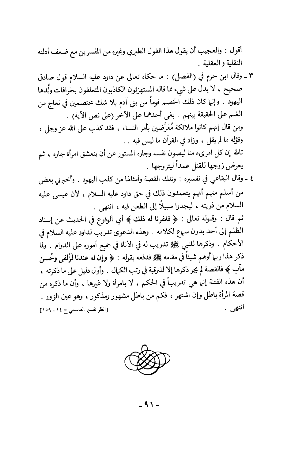 2 - قول المفسرين {حَتَّى تَوَارَتْ} أي الشمس: لا دليل عليه أيضًا لأن الشمس ليس لها ذكر من قريب أو بعيد، والأقرب هو ذكر الخيل، فيكون المعنى: حتى توارت الخيل واختفت عن نظر سليمان -عليه السلام-.