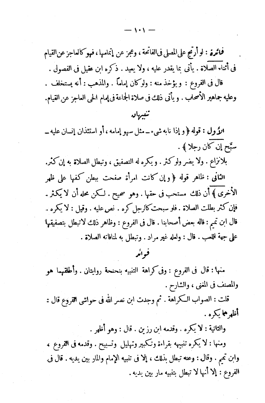 فَوَائِدُ. مِنْهَا: قَالَ فِي الْفُرُوعِ: وَفِي كَرَاهَةِ التَّنْبِيهِ بِنَحْنَحَةٍ رِوَايَتَانِ، وَأَطْلَقَهُمَا هُوَ وَالْمُصَنِّفُ فِي الْمُغْنِي، وَالشَّارِحُ، قُلْت: الصَّوَابُ الْكَرَاهَةُ ثُمَّ وَجَدْت ابْنَ نَصْرِ اللَّهِ فِي حَوَاشِي الْفُرُوعِ قَالَ: أَظْهَرُهُمَا يُكْرَهُ، وَالثَّانِيَةُ: لَا يُكْرَهُ وَقَدَّمَهُ ابْنُ رَزِينٍ قَالَ: وَهُوَ أَظْهَرُ، وَمِنْهَا: لَا يُكْرَهُ تَنْبِيهُهُ بِقِرَاءَةٍ وَتَكْبِيرٍ وَتَهْلِيلٍ وَتَسْبِيحٍ وَقَدَّمَهُ فِي الْفُرُوعِ، وَابْنُ تَمِيمٍ، وَقَالَ: وَعَنْهُ تَبْطُلُ بِذَلِكَ، إلَّا فِي تَنْبِيهِ الْإِمَامِ وَالْمَارِّ بَيْنَ يَدَيْهِ، قَالَ فِي الْفُرُوعِ: إلَّا أَنَّهَا لَا تَبْطُلُ بِتَنْبِيهِ مَارٍّ بَيْنَ يَدَيْهِ.