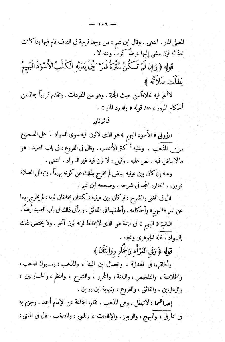 فَائِدَتَانِ. الْأُولَى (الْأَسْوَدُ الْبَهِيمُ) هُوَ الَّذِي لَا لَوْنَ فِيهِ سِوَى السَّوَادِ، عَلَى الصَّحِيحِ مِنْ الْمَذْهَبِ، وَعَلَيْهِ أَكْثَرُ الْأَصْحَابِ، وَقَالَ فِي الْفُرُوعِ، فِي بَابِ الصَّيْدِ: هُوَ مَا لَا بَيَاضَ فِيهِ نَصَّ عَلَيْهِ، وَقِيلَ: لَا لَوْنَ فِيهِ غَيْرُ السَّوَادِ. انْتَهَى. وَعَنْهُ إنْ كَانَ بَيْنَ عَيْنَيْهِ بَيَاضٌ لَمْ يَخْرُجْ بِذَلِكَ عَنْ كَوْنِهِ بَهِيمًا، وَتَبْطُلُ الصَّلَاةُ بِمُرُورِهِ اخْتَارَهُ الْمَجْدُ فِي شَرْحِهِ وَصَحَّحَهُ ابْنُ تَمِيمٍ قَالَ فِي الْمُغْنِي وَالشَّرْحِ: لَوْ كَانَ بَيْنَ عَيْنَيْهِ نُكْتَتَانِ يُخَالِفَانِ لَوْنَهُ، لَمْ يَخْرُجْ بِهِمَا عَنْ اسْمِ " الْبَهِيمِ " وَأَحْكَامِهِ، وَأَطْلَقَهُمَا فِي الْفَائِقِ، وَيَأْتِي ذَلِكَ فِي بَابِ الصَّيْدِ أَيْضًا. الثَّانِيَةُ " الْبَهِيمُ " فِي اللُّغَةِ هُوَ الَّذِي لَا يُخَالِطُ لَوْنَهُ لَوْنٌ آخَرُ، وَلَا يَخْتَصُّ ذَلِكَ بِالسَّوَادِ، قَالَهُ الْجَوْهَرِيُّ وَغَيْرُهُ.