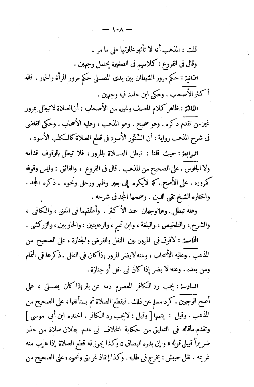 الثَّانِيَةُ: حُكْمُ مُرُورِ الشَّيْطَانِ بَيْنَ يَدَيْ الْمُصَلِّي حُكْمُ مُرُورِ الْمَرْأَةِ وَالْحِمَارِ، قَالَهُ أَكْثَرُ الْأَصْحَابِ، وَحَكَى ابْنُ حَامِدٍ فِيهِ وَجْهَيْنِ الثَّالِثَةُ: ظَاهِرُ كَلَامِ الْمُصَنِّفِ وَغَيْرِهِ مِنْ الْأَصْحَابِ: أَنَّ الصَّلَاةَ لَا تَبْطُلُ بِمُرُورِ غَيْرِ مَنْ تَقَدَّمَ ذِكْرُهُ، وَهُوَ صَحِيحٌ، وَهُوَ الْمَذْهَبُ، وَعَلَيْهِ الْأَصْحَابُ، وَحَكَى الْقَاضِي فِي شَرْحِ الْمَذْهَبِ رِوَايَةً: أَنَّ السِّنَّوْرَ الْأَسْوَدَ فِي قَطْعِ الصَّلَاةِ كَالْكَلْبِ الْأَسْوَدِ.
