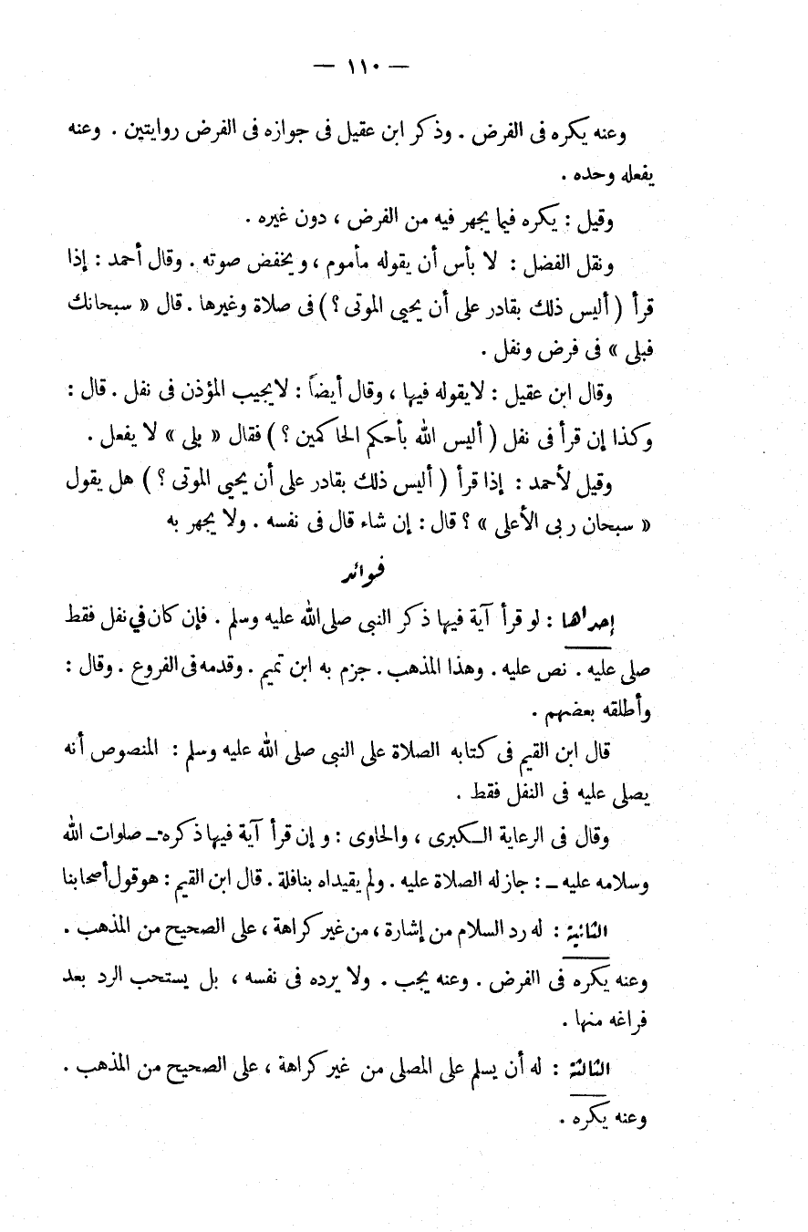 فَوَائِدُ. إحْدَاهُمَا: لَوْ قَرَأَ آيَةً فِيهَا ذِكْرُ النَّبِيِّ - صَلَّى اللَّهُ عَلَيْهِ وَسَلَّمَ - فَإِنْ كَانَ فِي نَفْلٍ فَقَطْ صَلَّى عَلَيْهِ نَصَّ عَلَيْهِ، وَهَذَا الْمَذْهَبُ جَزَمَ بِهِ ابْنُ تَمِيمٍ وَقَدَّمَهُ فِي الْفُرُوعِ، وَقَالَ: وَأَطْلَقَهُ بَعْضُهُمْ قَالَ ابْنُ الْقَيِّمِ فِي كِتَابِهِ الصَّلَاةُ عَلَى النَّبِيِّ - صَلَّى اللَّهُ عَلَيْهِ وَسَلَّمَ -: الْمَنْصُوصُ أَنَّهُ يُصَلِّي عَلَيْهِ فِي النَّفْلِ فَقَطْ، وَقَالَ فِي الرِّعَايَةِ الْكُبْرَى، وَالْحَاوِي: وَإِنْ قَرَأَ آيَةً فِيهَا ذِكْرُهُ - صَلَوَاتُ اللَّهِ وَسَلَامُهُ عَلَيْهِ -: جَازَ لَهُ الصَّلَاةُ عَلَيْهِ، وَلَمْ يُقَيِّدَاهُ بِنَافِلَةٍ قَالَ ابْنُ الْقَيِّمِ: هُوَ قَوْلُ أَصْحَابِنَا الثَّانِيَةُ: لَهُ رَدُّ السَّلَامِ مِنْ إشَارَةٍ، مِنْ غَيْرِ كَرَاهَةٍ، عَلَى الصَّحِيحِ مِنْ الْمَذْهَبِ، وَعَنْهُ يَكْرَه فِي الْفَرْض، وَعَنْهُ يَجِبُ، وَلَا يَرُدُّهُ فِي نَفْسِهِ، بَلْ يُسْتَحَبُّ الرَّدُّ بَعْدَ فَرَاغِهِ مِنْهَا.