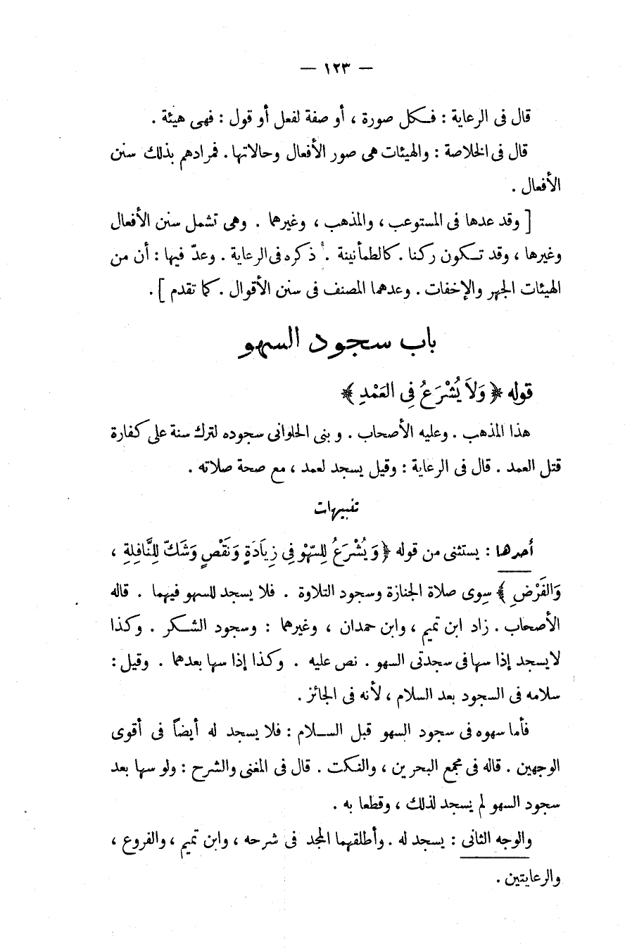 ِ قَوْلُهُ (وَلَا يُشْرَعُ فِي الْعَمْدِ) هَذَا الْمَذْهَبُ، وَعَلَيْهِ الْأَصْحَابُ. وَبَنَى الْحَلْوَانِيُّ سُجُودَهُ لِتَرْكِ سُنَّةٍ عَلَى كَفَّارَةِ قَتْلِ الْعَمْدِ. قَالَ فِي الرِّعَايَةِ: وَقِيلَ يَسْجُدُ لِعَمْدٍ، مَعَ صِحَّةِ صَلَاتِهِ.