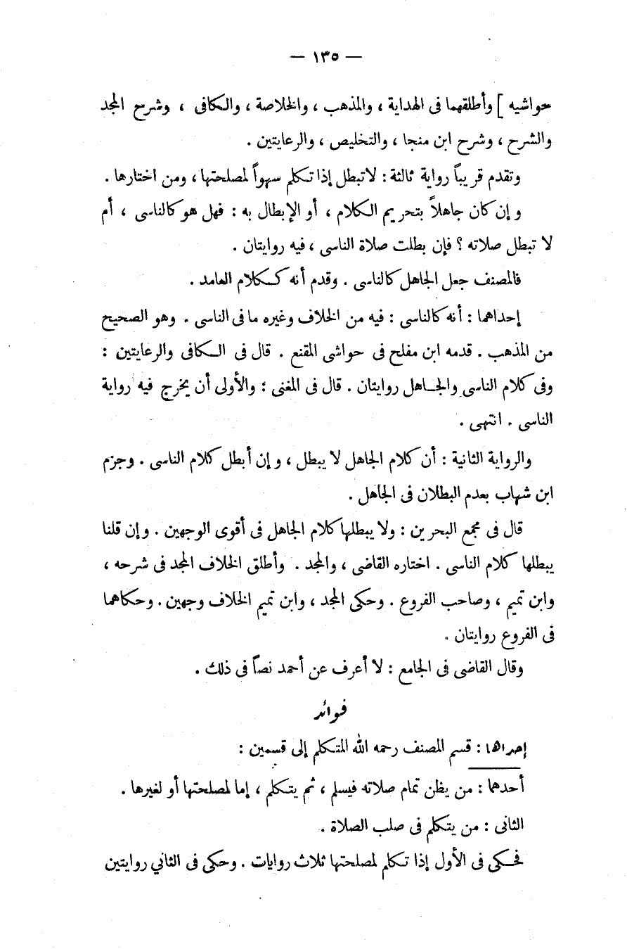 فَوَائِدُ. إحْدَاهُمَا: قَسَّمَ الْمُصَنِّفُ - رَحِمَهُ اللَّهُ - الْمُتَكَلِّمَ إلَى قِسْمَيْنِ: أَحَدُهُمَا: مَنْ يَظُنُّ تَمَامَ صَلَاتِهِ فَيُسَلِّمَ، ثُمَّ يَتَكَلَّمَ إمَّا لِمَصْلَحَتِهَا أَوْ لِغَيْرِهَا. الثَّانِي: مَنْ يَتَكَلَّمُ فِي صُلْبِ الصَّلَاةِ فَحَكَى فِي الْأَوَّلِ إذَا تَكَلَّمَ لِمَصْلَحَتِهَا ثَلَاثَ رِوَايَاتٍ، وَحَكَى فِي الثَّانِي رِوَايَتَيْنِ