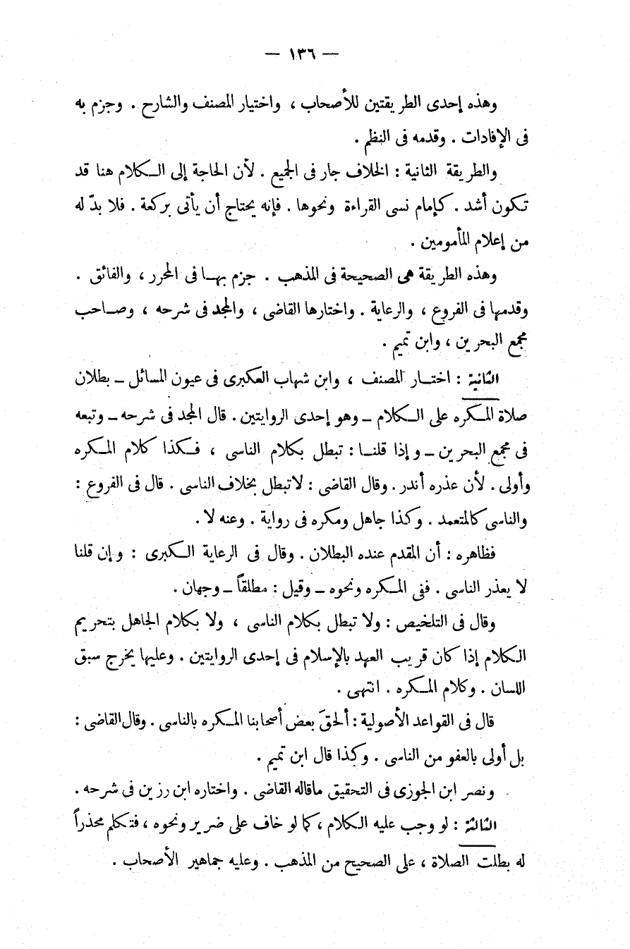 وَهَذِهِ إحْدَى الطَّرِيقَتَيْنِ لِلْأَصْحَابِ، وَاخْتِيَارُ الْمُصَنِّفِ وَالشَّارِحِ وَجَزَمَ بِهِ فِي الْإِفَادَاتِ وَقَدَّمَهُ فِي النَّظْمِ، وَالطَّرِيقَةُ الثَّانِيَةُ: الْخِلَافُ جَارٍ فِي الْجَمِيعِ؛ لِأَنَّ الْحَاجَةَ إلَى الْكَلَامِ هُنَا قَدْ تَكُونُ أَشَدَّ كَإِمَامٍ نَسِيَ الْقِرَاءَةَ وَنَحْوَهَا فَإِنَّهُ يَحْتَاجُ أَنْ يَأْتِيَ بِرَكْعَةٍ فَلَا بُدَّ لَهُ مِنْ إعْلَامِ الْمَأْمُومِينَ، وَهَذِهِ الطَّرِيقَةُ هِيَ الصَّحِيحَةُ فِي الْمَذْهَبِ جَزَمَ بِهَا فِي الْمُحَرَّرِ، وَالْفَائِقِ، وَقَدَّمَهَا فِي الْفُرُوعِ، وَالرِّعَايَةِ وَاخْتَارَهَا الْقَاضِي، وَالْمَجْدُ فِي شَرْحِهِ، وَصَاحِبُ مَجْمَعِ الْبَحْرَيْنِ، وَابْنُ تَمِيمٍ، الثَّانِيَةُ: اخْتَارَ الْمُصَنِّفُ، وَابْنُ شِهَابٍ الْعُكْبَرِيُّ فِي عُيُونِ الْمَسَائِلِ بُطْلَانَ صَلَاةِ الْمُكْرَهِ عَلَى الْكَلَامِ وَهُوَ إحْدَى الرِّوَايَتَيْنِ قَالَ الْمَجْدُ فِي شَرْحِهِ وَتَبِعَهُ فِي مَجْمَعِ الْبَحْرَيْنِ وَإِذَا قُلْنَا: تَبْطُلُ بِكَلَامِ النَّاسِي فَكَذَا كَلَامُ الْمُكْرَهِ أَوْلَى؛ لِأَنَّ عُذْرَهُ أَنْدَرُ، وَقَالَ الْقَاضِي: لَا تَبْطُلُ بِخِلَافِ النَّاسِي قَالَ فِي الْفُرُوعِ: وَالنَّاسِي كَالْمُتَعَمِّدِ، وَكَذَا جَاهِلٌ وَمُكْرَهٌ فِي رِوَايَةٍ، وَعَنْهُ لَا فَظَاهِرُهُ: أَنَّ الْمُقَدَّمَ عِنْدَهُ الْبُطْلَانُ، وَقَالَ فِي الرِّعَايَةِ الْكُبْرَى: وَإِنْ قُلْنَا لَا يُعْذَرُ النَّاسِي فَفِي الْمُكْرَهِ وَنَحْوِهِ وَقِيلَ: مُطْلَقًا وَجْهَانِ، وَقَالَ فِي التَّلْخِيصِ: وَلَا تَبْطُلُ بِكَلَامِ النَّاسِي، وَلَا بِكَلَامِ الْجَاهِلِ بِتَحْرِيمِ الْكَلَامِ إذَا كَانَ قَرِيبَ الْعَهْدِ بِالْإِسْلَامِ فِي إحْدَى الرِّوَايَتَيْنِ، وَعَلَيْهِمَا يَخْرُجُ سَبْقُ اللِّسَانِ، وَكَلَامُ الْمُكْرَهِ. انْتَهَى. قَالَ فِي الْقَوَاعِدِ الْأُصُولِيَّةِ: أَلْحَقَ بَعْضُ أَصْحَابِنَا الْمُكْرَهَ بِالنَّاسِي، وَقَالَ الْقَاضِي: بَلْ أَوْلَى بِالْعَفْوِ مِنْ النَّاسِي، وَكَذَا قَالَ ابْنُ تَمِيمٍ وَنَصَرَ ابْنُ الْجَوْزِيِّ فِي التَّحْقِيقِ مَا قَالَهُ الْقَاضِي وَاخْتَارَهُ ابْنُ رَزِينٍ فِي شَرْحِهِ، الثَّالِثَةُ: لَوْ وَجَبَ عَلَيْهِ الْكَلَامُ كَمَا لَوْ خَافَ عَلَى ضَرِيرٍ وَنَحْوِهِ، فَتَكَلَّمَ مُحَذِّرًا لَهُ بَطَلَتْ الصَّلَاةُ، عَلَى الصَّحِيحِ مِنْ الْمَذْهَبِ، وَعَلَيْهِ جَمَاهِيرُ الْأَصْحَابِ.