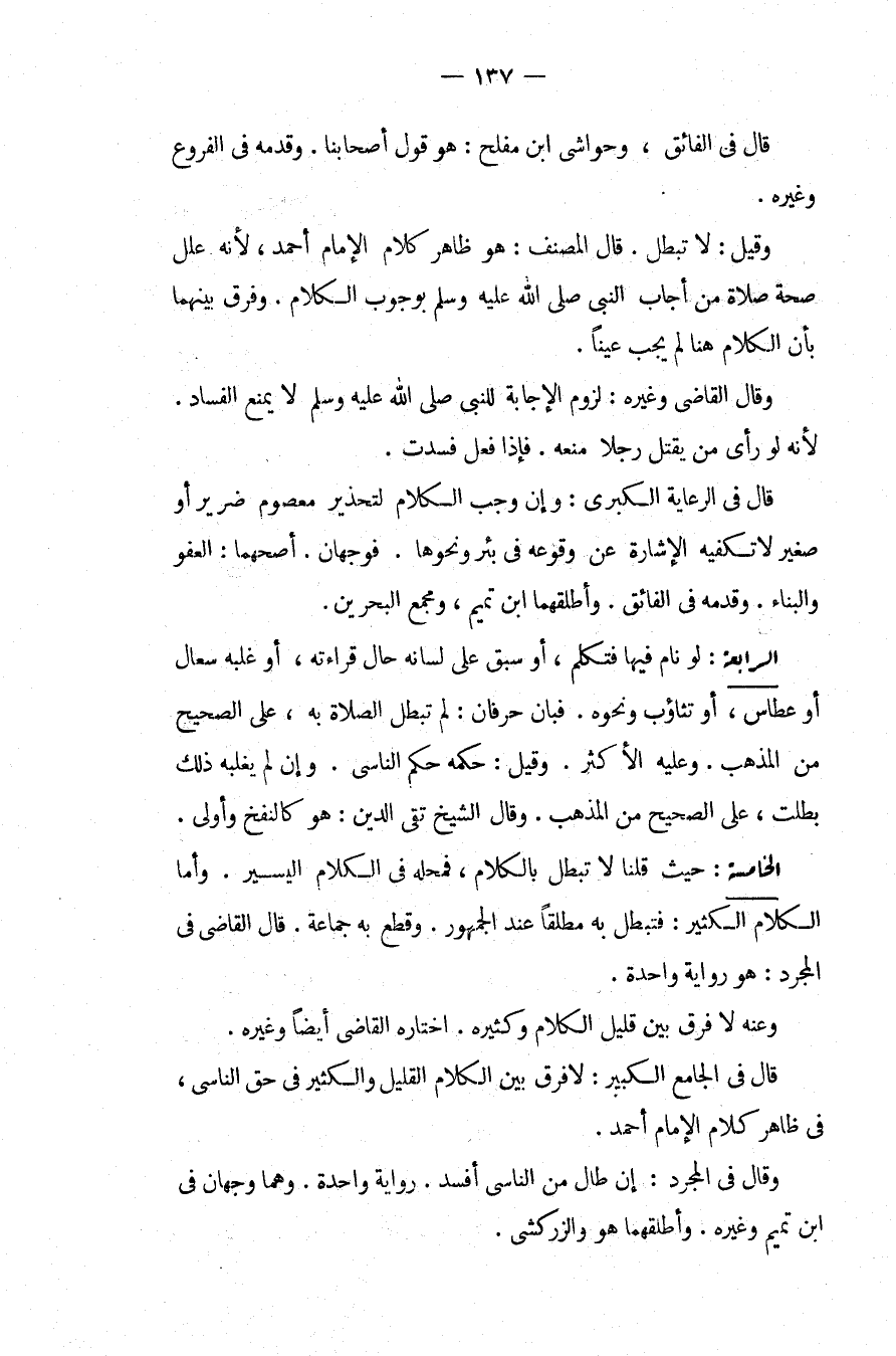 الرَّابِعَةُ: لَوْ نَامَ فِيهَا فَتَكَلَّمَ، أَوْ سَبَقَ عَلَى لِسَانِهِ حَالَ قِرَاءَتِهِ، أَوْ غَلَبَهُ سُعَالٌ أَوْ عُطَاسٌ، أَوْ تَثَاؤُبٌ وَنَحْوُهُ فَبَانَ حَرْفَانِ: لَمْ تَبْطُلْ الصَّلَاةُ بِهِ، عَلَى الصَّحِيحِ مِنْ الْمَذْهَبِ، وَعَلَيْهِ الْأَكْثَرُ، وَقِيلَ: حُكْمُهُ حُكْمُ النَّاسِي، وَإِنْ لَمْ يَغْلِبْهُ ذَلِكَ بَطَلَتْ، عَلَى الصَّحِيحِ مِنْ الْمَذْهَبِ، وَقَالَ الشَّيْخُ تَقِيُّ الدِّينِ: هُوَ كَالنَّفْخِ وَأَوْلَى. الْخَامِسَةُ: حَيْثُ قُلْنَا لَا تَبْطُلُ بِالْكَلَامِ، فَمَحَلُّهُ فِي الْكَلَامِ الْيَسِيرِ، وَأَمَّا الْكَلَامُ الْكَثِيرُ: فَتَبْطُلُ بِهِ مُطْلَقًا عِنْدَ الْجُمْهُورِ وَقَطَعَ بِهِ جَمَاعَةٌ قَالَ الْقَاضِي فِي الْمُجَرَّدِ: هُوَ رِوَايَةٌ وَاحِدَةٌ، وَعَنْهُ لَا فَرْقَ بَيْنَ قَلِيلِ الْكَلَامِ وَكَثِيرِهِ اخْتَارَهُ الْقَاضِي أَيْضًا وَغَيْرُهُ قَالَ فِي الْجَامِعِ الْكَبِيرِ: لَا فَرْقَ بَيْنَ الْكَلَامِ الْقَلِيلِ وَالْكَثِيرِ فِي حَقِّ النَّاسِي، فِي ظَاهِرِ كَلَامِ الْإِمَامِ أَحْمَدَ، وَقَالَ فِي الْمُجَرَّدِ: إنْ طَالَ مِنْ النَّاسِي أَفْسَدَ رِوَايَةً وَاحِدَةً، وَهُمَا وَجْهَانِ فِي ابْنِ تَمِيمٍ وَغَيْرِهِ، وَأَطْلَقَهُمَا هُوَ وَالزَّرْكَشِيُّ.