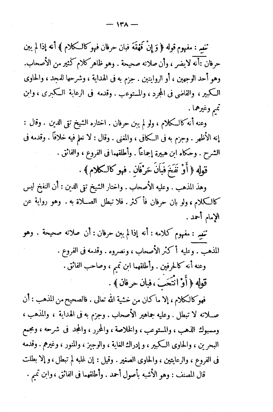 تَنْبِيهٌ: مَفْهُومُ كَلَامِهِ: أَنَّهُ إذَا لَمْ يَبِنْ حَرْفَانِ: أَنَّ صَلَاتَهُ صَحِيحَةٌ، وَهُوَ الْمَذْهَبُ، وَعَلَيْهِ أَكْثَرُ الْأَصْحَابِ، وَنَصَرُوهُ وَقَدَّمَهُ فِي الْفُرُوعِ، وَعَنْهُ أَنَّهُ كَالْحَرْفَيْنِ، وَأَطْلَقَهُمَا ابْنُ تَمِيمٍ، وَصَاحِبُ الْفَائِقِ، قَوْلُهُ (أَوْ انْتَحَبَ، فَبَانَ حَرْفَانِ) فَهُوَ كَالْكَلَامِ، إلَّا مَا كَانَ مِنْ خَشْيَةِ اللَّهِ تَعَالَى فَالصَّحِيحُ مِنْ الْمَذْهَبِ: أَنَّ صَلَاتَهُ لَا تَبْطُلُ، وَعَلَيْهِ جَمَاهِيرُ الْأَصْحَابِ وَجَزَمَ بِهِ فِي الْهِدَايَةِ، وَالْمُذْهَبِ، وَمَسْبُوكِ الذَّهَبِ، وَالْمُسْتَوْعِبِ، وَالْخُلَاصَةِ، وَالْمُحَرَّرِ، وَالْمَجْدِ فِي شَرْحِهِ، وَمَجْمَعِ الْبَحْرَيْنِ، وَالْحَاوِي الْكَبِيرِ، وَإِدْرَاكِ الْغَايَةِ، وَالْوَجِيزِ، وَالْمُنَوِّرِ، وَغَيْرِهِمْ وَقَدَّمَهُ فِي الْفُرُوعِ، وَالرِّعَايَتَيْنِ، وَالْحَاوِي الصَّغِيرِ، وَقِيلَ: إنْ غَلَبَهُ لَمْ تَبْطُلْ، وَإِلَّا بَطَلَتْ قَالَ الْمُصَنِّفُ: وَهُوَ الْأَشْبَهُ بِأُصُولِ أَحْمَدَ، وَأَطْلَقَهُمَا فِي الْفَائِقِ، وَابْنِ تَمِيمٍ. .
