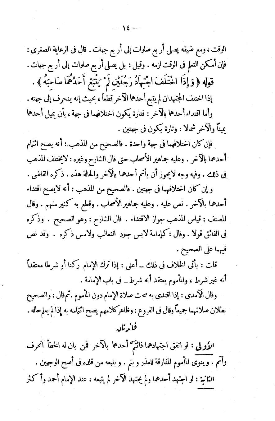 فَائِدَتَانِ الْأُولَى: لَوْ اتَّفَقَ اجْتِهَادُهُمَا فَأَتَمَّ أَحَدُهُمَا بِالْآخَرِ فَمَنْ بَانَ لَهُ الْخَطَأُ انْحَرَفَ وَأَتَمَّ، وَيَنْوِي الْمَأْمُومُ الْمُفَارَقَةَ لِلْعُذْرِ وَيُتِمُّ، وَيَتْبَعُهُ مَنْ قَلَّدَهُ فِي أَصَحِّ الْوَجْهَيْنِ الثَّانِيَةُ: لَوْ اجْتَهَدَ أَحَدُهُمَا وَلَمْ يَجْتَهِدْ الْآخَرُ لَمْ يَتْبَعْهُ، عِنْدَ الْإِمَامِ أَحْمَدَ وَأَكْثَرِ