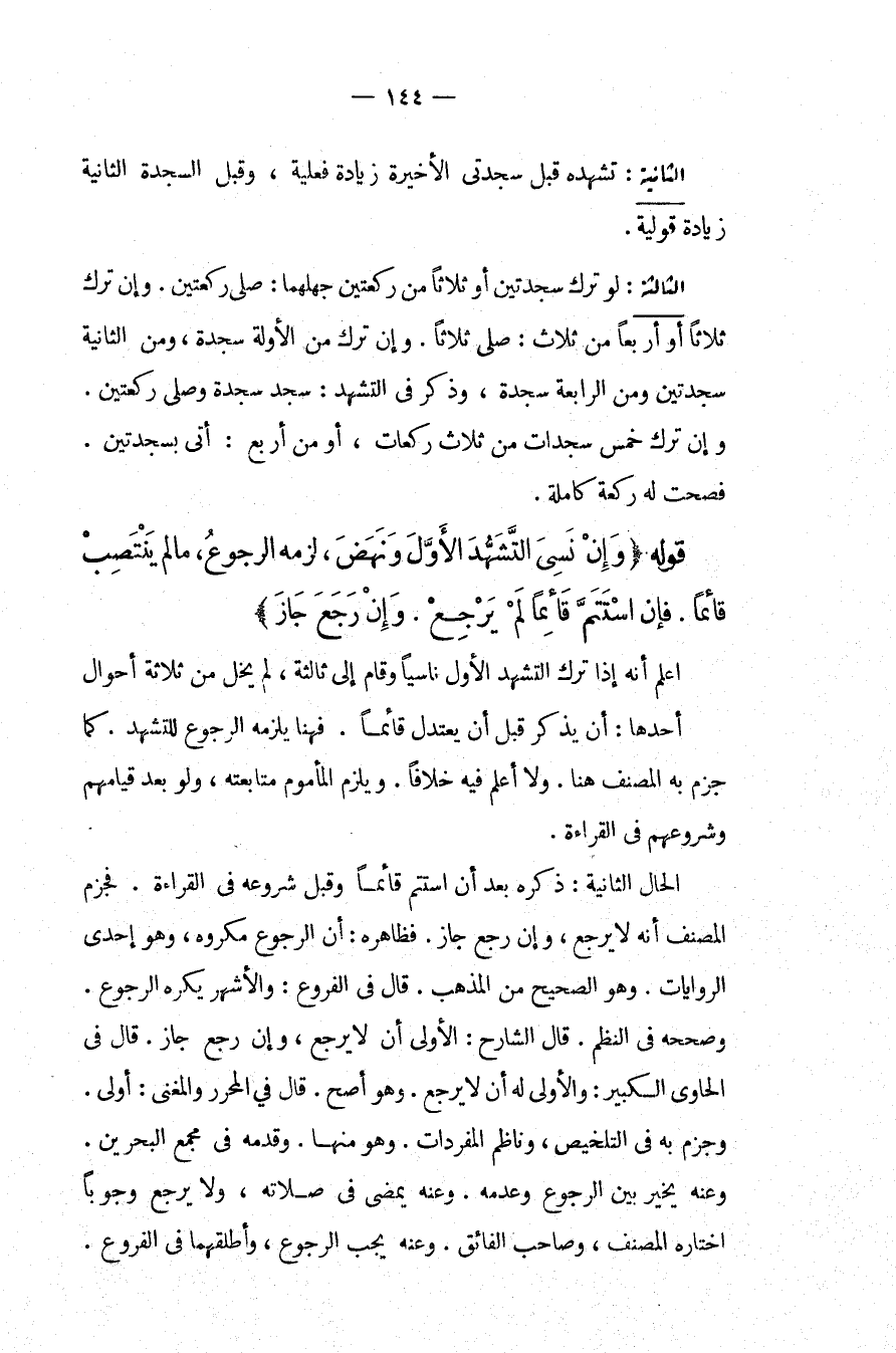 قَوْلُهُ (وَإِنْ نَسِيَ التَّشَهُّدَ الْأَوَّلَ وَنَهَضَ، لَزِمَهُ الرُّجُوعُ مَا لَمْ يَنْتَصِبْ قَائِمًا فَإِنْ اسْتَتَمَّ قَائِمًا لَمْ يَرْجِعْ، وَإِنْ رَجَعَ جَازَ) اعْلَمْ أَنَّهُ إذَا تَرَكَ التَّشَهُّدَ الْأَوَّلَ نَاسِيًا وَقَامَ إلَى ثَالِثَةٍ، لَمْ يَخْلُ مِنْ ثَلَاثَةِ أَحْوَالٍ أَحَدُهَا: أَنْ يَذْكُرَ قَبْلَ أَنْ يَعْتَدِلَ قَائِمًا فَهُنَا يَلْزَمُهُ الرُّجُوعُ لِلتَّشَهُّدِ كَمَا جَزَمَ بِهِ الْمُصَنِّفُ هُنَا، وَلَا أَعْلَمُ فِيهِ خِلَافًا، وَيَلْزَمُ الْمَأْمُومَ مُتَابَعَتُهُ، وَلَوْ بَعْدَ قِيَامِهِمْ وَشُرُوعِهِمْ فِي الْقِرَاءَةِ.