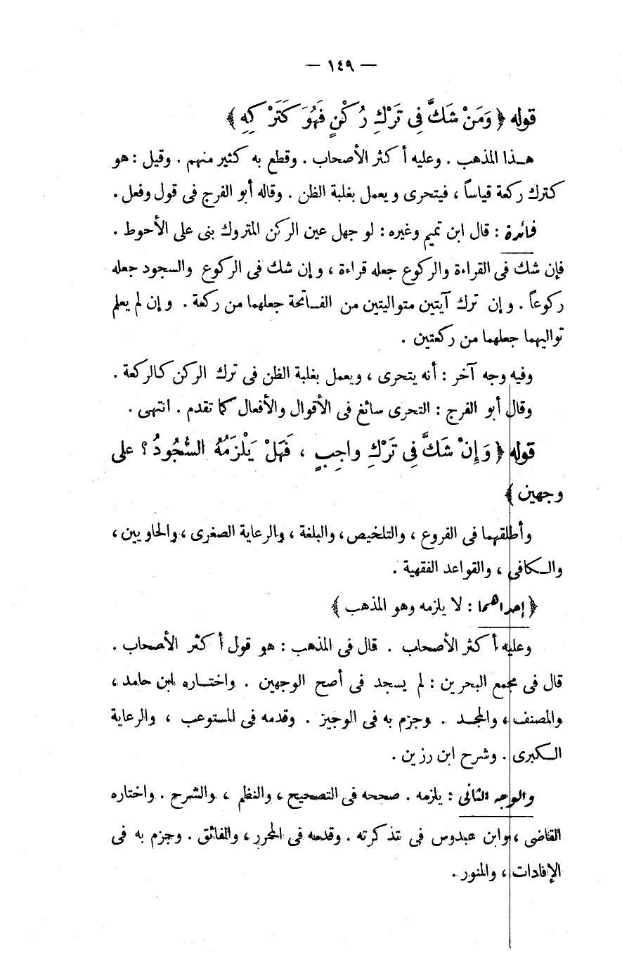 قَوْلُهُ (وَإِنْ شَكَّ فِي تَرْكِ وَاجِبٍ، فَهَلْ يَلْزَمُهُ السُّجُودُ؟ عَلَى وَجْهَيْنِ) وَأَطْلَقَهُمَا فِي الْفُرُوعِ، وَالتَّلْخِيصِ، وَالْبُلْغَةِ، وَالرِّعَايَةِ الصُّغْرَى، وَالْحَاوِيَيْنِ، وَالْكَافِي، وَالْقَوَاعِدِ الْفِقْهِيَّةِ. (إحْدَاهُمَا: لَا يَلْزَمُهُ وَهُوَ الْمَذْهَبُ) وَعَلَيْهِ أَكْثَرُ الْأَصْحَابِ قَالَ فِي الْمُذْهَبِ: هُوَ قَوْلُ أَكْثَرِ الْأَصْحَابِ قَالَ فِي مَجْمَعِ الْبَحْرَيْنِ: لَمْ يَسْجُدْ فِي أَصَحِّ الْوَجْهَيْنِ وَاخْتَارَهُ ابْنُ حَامِدٍ، وَالْمُصَنِّفُ، وَالْمَجْدُ وَجَزَمَ بِهِ فِي الْوَجِيزِ وَقَدَّمَهُ فِي الْمُسْتَوْعِبِ، وَالرِّعَايَةِ الْكُبْرَى، وَشَرْحِ ابْنِ رَزِينٍ، وَالْوَجْهُ الثَّانِي: يَلْزَمُهُ صَحَّحَهُ فِي التَّصْحِيحِ، وَالنَّظْمِ، وَالشَّرْحِ وَاخْتَارَهُ الْقَاضِي، وَابْنُ عَبْدُوسٍ فِي تَذْكِرَتِهِ وَقَدَّمَهُ فِي الْمُحَرَّرِ، وَالْفَائِقِ وَجَزَمَ بِهِ فِي الْإِفَادَاتِ، وَالْمُنَوِّرِ.